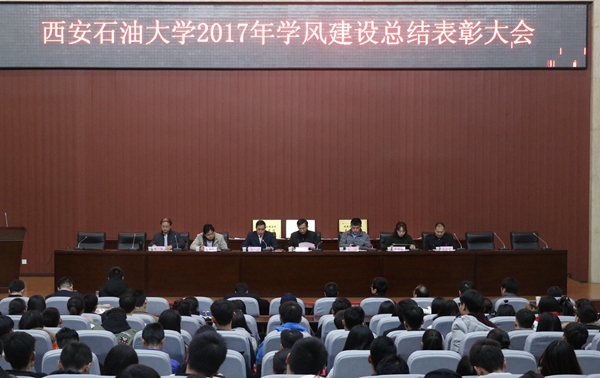 会上表彰了2016-2017年学风建设年先进单位、国家奖学金获得者、中国石油奖学金获得者、优良学风班、先进班集体、主题班团会优秀班级、素质拓展优秀团队、三好学生、优秀学生干部、文明宿舍、标兵宿舍等先进集体和个人。石油工程学院党委副书记张建高代表学风建设年先进单位作了经验交流发言。计算机学院通信1502班王胤禛、经济管理学院ACA1602班曹璋颖两位同学分别代表先进集体和先进个人作了发言。