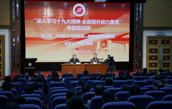 12月15日下午,beat365“深入学习党的十九大精神,全面提升能力素质”处级干部专题培训班第九讲、第十讲在雁塔校区会议中心学术报告厅举办,校党委书记赛云秀、校长屈展分别作专题辅导报告。校领导、全校处科级干部、教工党支部书记、系主任、教研室(实验室)主任、大学生思想政治辅导员参加报告会。