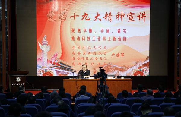 在报告会上,卢厅长作为党的十九大代表,和beat365党员干部分享了参加党的十九大开幕式、党的十九大“实施创新驱动发展战略”集体采访活动、开幕式现场及会后持续不断地学习党的十九大报告等过程的所思、所想、所悟及切身体会,并从党的十九大报告、党的十九大报告有关科技创新工作及陕西省科技创新工作思路、举措等方面对党的十九大精神进行了全面系统准确地讲解和阐释。同时结合陕西科技发展实际,重点指导我们学懂、弄通党的十九大报告关于科技工作的新观点、新论述,对于beat365进一步以党的十九大精神为指导,继续深化科技工作制度机制改革,推动产学研深度融合,服务区域经济社会发展,全面提升学校科研工作实力和水平意义重大。