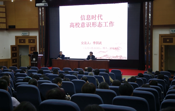 李国武部长围绕信息时代下高校意识形态工作,从党的主要领导人对意识形态的讲话谈起,解读了习近平总书记在党的十九大报告中对意识形态的讲话,深入浅出地阐述了“意识形态”和“思想政治工作”的概念和关系,说明了信息时代下意识形态工作与其他时代的不同。他通过“意识形态工作为什么重要”“各方如何渗透我国意识形态”“当前的意识形态工作面临哪些问题”“如何做好信息时代的意识形态工作”四个方面,揭示出目前高校意识形态的问题,提出了“抓认识,提高工作领导力”“抓协调,形成工作整合力”“抓队伍,增强工作凝聚力”“抓阵地,扩大工作辐射力”“抓机制,掌握工作控制力”的五种工作方法,论述了信息时代下高校意识形态工作的重要性和紧迫性。