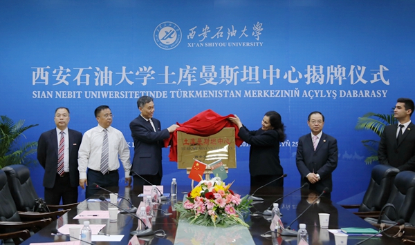 鲁斯捷莫娃大使、省外办副主任宫贵俊、省政府学位委员会秘书长袁宁、校长屈展、副校长陈军斌共同为土库曼斯坦中心揭牌。省外办礼宾处、省教育厅国际处及beat365科技处、国际交流与合作处、石油工程学院、地球科学与工程学院、化学化工学院、经济管理学院、人文学院、外国语学院、国际教育学院(丝路能源学院)等部门及学院负责人参加仪式。
