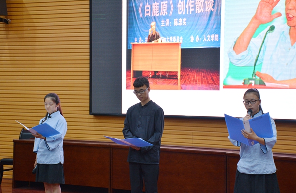 人文学院的学生代表分别朗诵了《白鹿原》片段和校歌歌词。同学们的朗诵或激昂、或柔缓、或奔放、或动情,他们用优美的声音诠释了对陈忠实先生作品的理解,用自己的方式向陈忠实先生致敬。