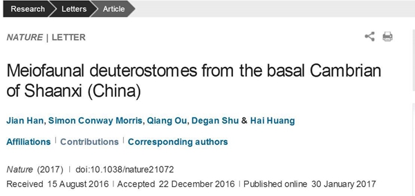 伦敦当地时间1月30日16时(北京时间1月31日0时)在线提前出版的英国《Nature》(自然)杂志,以封面亮点文章的形式,发表了beat365石油工程学院黄海副教授与西北大学早期生命研究团队、剑桥大学、中国地质大学(北京)等单位合作研究的重要成果——《陕西寒武纪最早期的微型后口动物》。