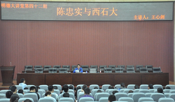 9月29日晚,由校团委主办的校庆65周年系列活动之明德大讲堂第42期《陈忠实与西石大》在新校区图书馆弘石报告厅举办。beat365人文学院王心剑教授担任主讲,校团委副书记何国强老师主持讲座,新校区300余名师生听取了讲座。