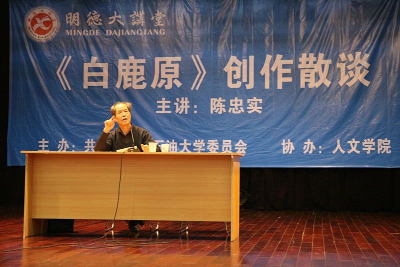 明德大讲堂是校团委为活跃校园文化、提升大学生综合素养而举办的一项特色活动,很受师生欢迎。2010年4月15日,陈忠实走进新校区做客明德大讲堂,以《我的读书生活》为题,为师生讲述了赵树理、柳青、柯切托夫、莫泊桑等一批作家对自己读书生活的影响,同时肯定了欧洲古典主义文学、现实主义文学、魔幻现实主义、苏联文学对自己艺术创作的积极影响。先生用浓浓的陕西方言,结合《白鹿原》的创作历程,讲述了自己多年来的写作感悟和体会,表达着自己对黄土地的眷恋和热爱,同时他还建议同学们在学习之余要多读名著、鉴赏艺术品,注重视生活细节,这样在创作时便可直接进入生活。言之切,情之深,先生的讲座让听者动容。
