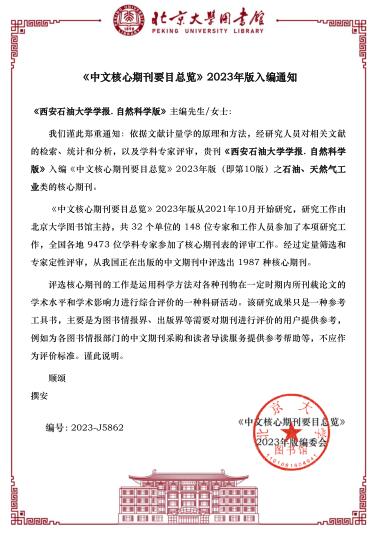 近日,接北京大学图书馆《中文核心期刊要目总览》2023年版编委会通知,《beat365官方网站学报(自然科学版)》入编《中文核心期刊要目总览》2023年版(即第10版)之石油、天然气工业类的核心期刊。这是本刊自2008年以来连续6次入选全国中文核心期刊。