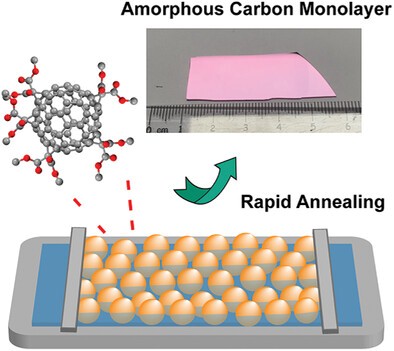 本研究中以改性的富勒烯单体为前驱体,通过Langmuir-Blodgett制膜-快速热解两步法制备了厘米尺寸的单层多孔非晶碳膜。研究证明其为亚稳态结构且不导电。此外,离子跨膜传输研究表明该膜具有阳离子选择性(选择性为26%)。这项工作对单层多孔非晶碳膜的可控制备具有指导意义。