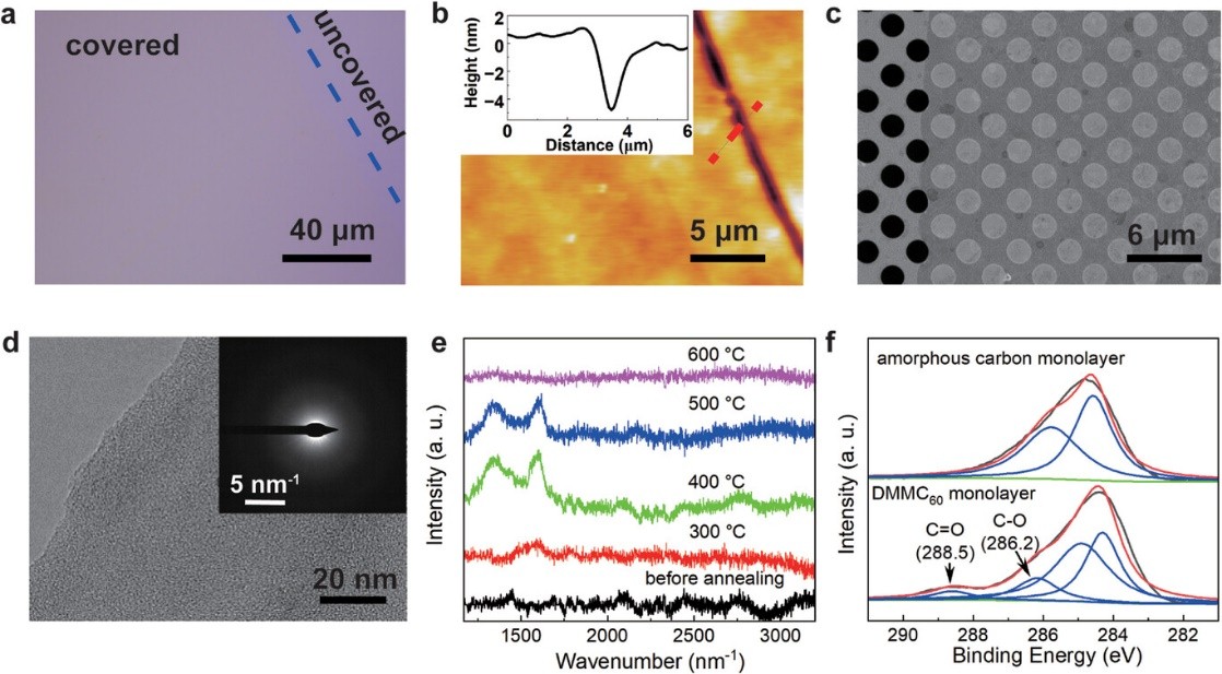 通过常压下可控热解富勒烯可以获得介于富勒烯型碳和石墨烯型碳之间的新型碳材料(Nature,2022, 606, 507)。经过断裂交联过程,富勒烯笼之间形成了纳米孔结构。但受限于制备方式,所剥离的单层膜一般为微米尺寸,较难进行膜性质研究。
