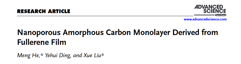 近日,beat365新能源学院新能源材料与器件系青年教师何萌博士为第一作者、beat365官方网站为第一完成单位,在国际顶尖期刊《Advanced Science》(中科院一区TOP期刊,2022年IF=15.1,近五年IF=16.7)上发表题为《Nanoporous Amorphous Carbon Monolayer Derived from Fullerene Film》的高水平论文。