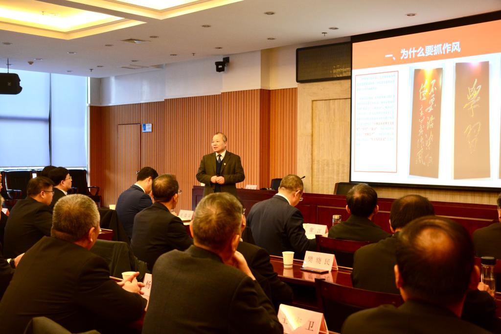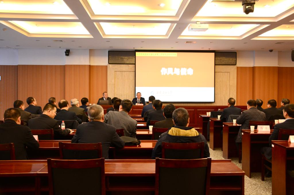 参观结束后,全体同志来到图书馆第一会议室。校铁人精神研究中心研究员郭岗彦为大家作《作风与使命》专题报告,校党委书记常江主持报告会。郭岗彦深入讲解了延安整风所取得的明显成效以及作为作风建设源头活水的重大意义,介绍了大庆石油会战靠“两论”起家、“两分法”前进的背景和效果,用生动的故事、躬身研究的珍藏,深刻阐释了大庆精神的历史定位、丰富内涵和时代价值,展现了石油人纵横千里、叱咤油田的恢弘气势和英雄形象。他进一步讲解了大庆会战对加强作风建设的高度重视,介绍了对干部工作作风“三个面向”“五到现场”“约法三章”的基本要求,对工人工作作风“四个一样”“三老四严”的基本要求,引用余秋里关于“培养作风实际上就是培养队伍战斗力”的论述,展开阐述了“严细准狠”的关键作用。