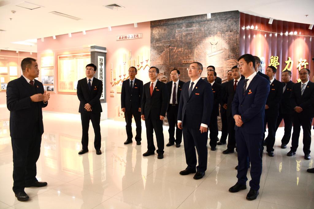 随后,常江、王进富等来到校史馆,重温老一辈无产阶级革命家对学校的亲切关怀,回顾筚路蓝缕、开拓进取的建校办学历史。在校史馆上半展区,展示了在习仲勋等老一辈无产阶级革命家关怀下,1951年学校创办的历史。秉承“艰苦创业、兴油报国”的办学理念,学校坚定起步,砥砺前行。50年代末,学校开启本科办学历程,广大师生不辱使命、励精图治,各项事业取得了较快发展。即使在学校遭受重创、停办改厂期间,依然坚持科技攻关,产生了一批科学研究和技术攻关成果。80年代初,学校弦歌复响、绛帐重开,迈入新的发展时期,并凝练形成了“团结、勤奋、求是、创新”八字校风。全体同志透过一个个展板、一件件历史实物,深刻感悟学校厚重的历史积淀、沧桑的办学历程,深切体会前辈们办学兴教的不易。厚重的历史提醒全体同志不忘来时道路的艰辛,务必牢记初心使命、赓续红色血脉。