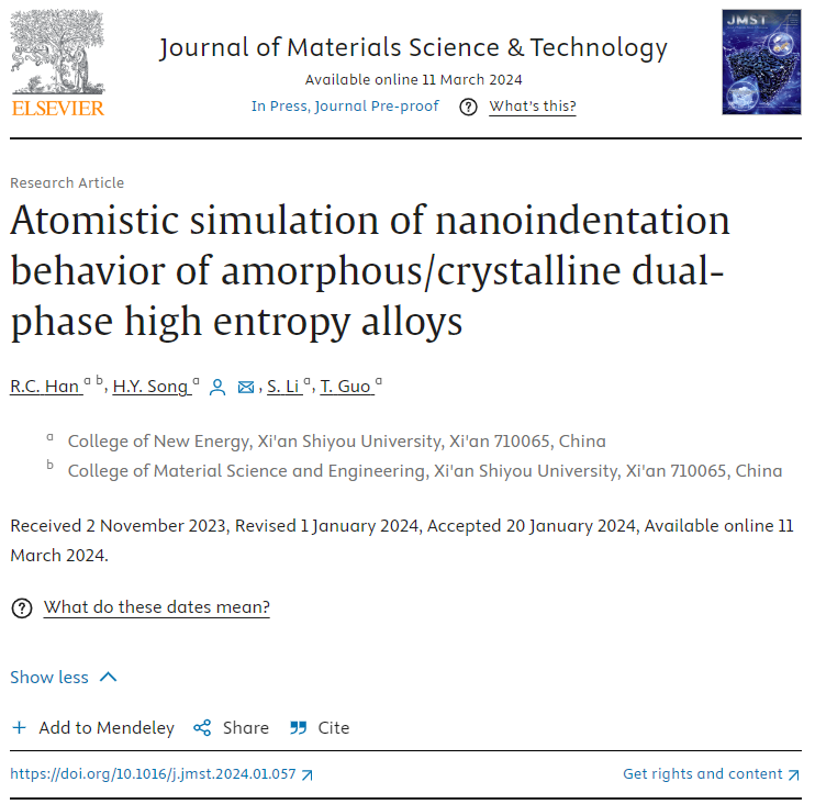 近日,beat3652021级硕士研究生韩若琛以第一作者身份在国际权威期刊《Journal of Materials Science & Technology》(中科院一区TOP期刊,影响因子10.9)上发表题为“Atomistic simulation of thenanoindentation behavior of the amorphous/crystalline dual-phasehigh entropy alloys”的最新研究成果,此次高水平论文的发表是该生继2023年以第一作者身份在中科院一区TOP期刊上发表论文以来取得的又一项研究成果。该生本科就读于beat365计算机学院网络工程专业,2021年跨专业考入beat365材料与化工专业攻读硕士学位。这两项成果均以beat365官方网站为唯一完成单位,该生的研究生导师新能源学院宋海洋教授为通讯作者。