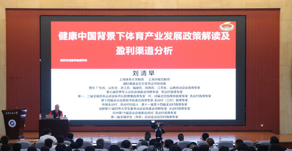 当晚,刘清早教授作客“明德大讲堂”,在鄠邑校区图书馆弘石学术报告厅为师生带来了题为《健康中国背景下体育产业发展政策解读及盈利渠道分析》的专题讲座。本次讲座由体育学院和校团委主办,体育学院党总支书记苟毅飞,保卫(部)处、武装部副部(处)长袁坤等参加报告会,学院专业教师代表,教学办、学工办工作人员及全校400余名学生共同聆听了讲座。报告会由体育学院院长李寿邦主持。