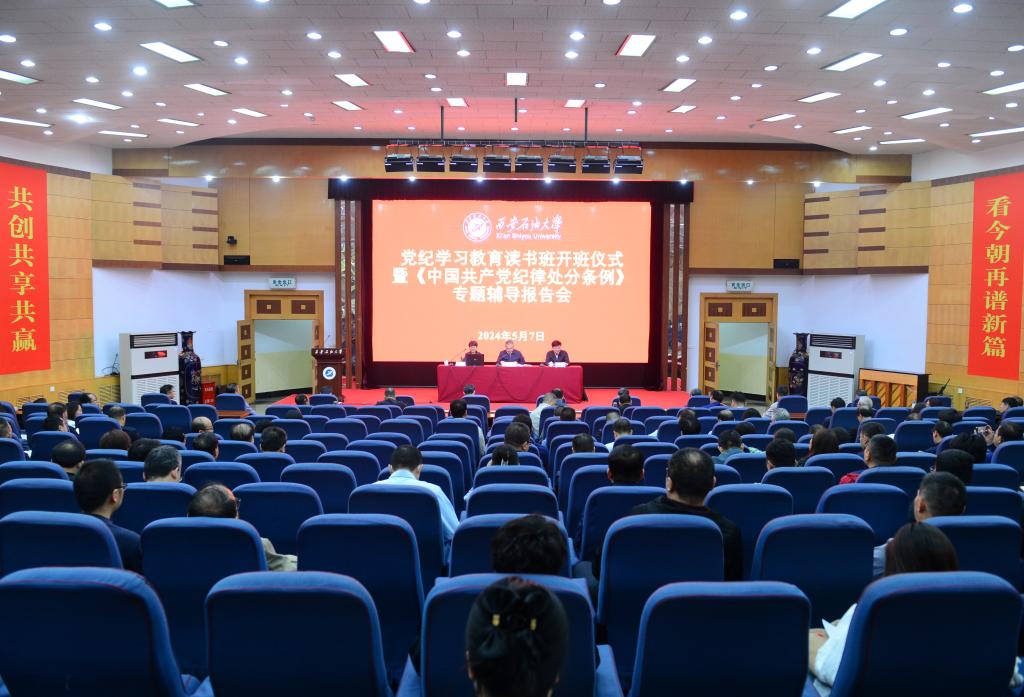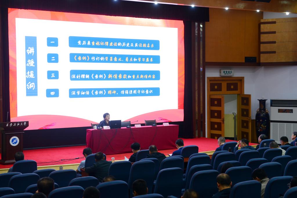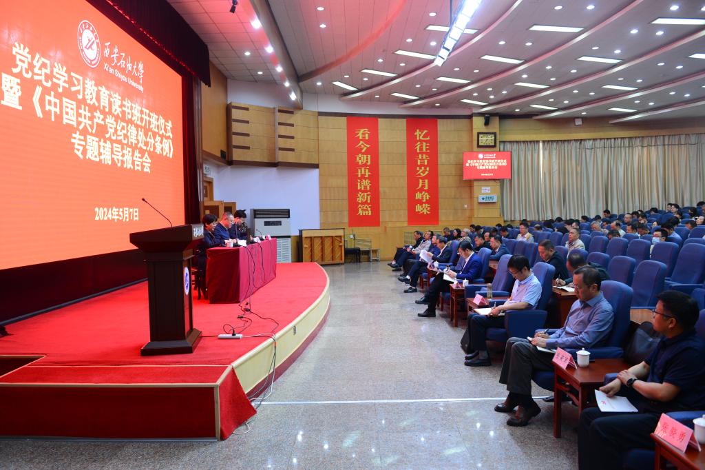 5月7日上午,学校在雁塔校区学术报告厅举行党纪学习教育读书班开班仪式暨《中国共产党纪律处分条例》(以下简称《条例》)专题辅导报告会。校党委书记、学校党纪学习教育工作专班主任常江对全校各级党组织进一步谋划好、组织好、开展好党纪学习教育,进行再动员再部署。中共陕西省委党校(陕西行政学院)李晓燕教授对新修订的《条例》进行集中辅导。全体校领导,全体处级干部和教职工党支部书记,学生党支部书记代表参加会议。会议由校党委副书记、纪委书记、监察专员,学校党纪学习教育工作专班常务副主任王辉强主持。