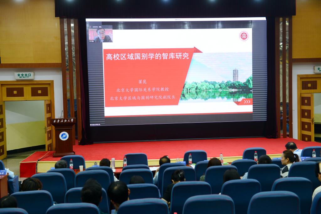 陕西省社会科学院副院长王建康,陕西省委宣传部对外宣传处处长王战军,陕西省教育厅科技处处长朱晓冬,陕西省文化和旅游厅一级调研员尹为民,陕西省社科联社会组织管理部部长张金高,中国石油集团经济技术研究院院长陆如泉教授,北京语言大学国别和区域研究院院长罗林教授,北京大学区域与国别研究院副院长翟崑教授,武汉大学中法非三方合作联盟副主席王战教授,察哈尔学会学术委员会副主任柯银斌教授,中国社会科学院西亚非洲研究所政治研究室主任唐志超教授,西北大学社科处处长韩志斌教授,西北大学王新刚教授线下或线上参会。beat365党政领导常江、王进富、张荣军、张君涛出席大会。beat365相关院(系)和职能部门主要负责人、教师代表和学生代表共300余人参加大会。研究院成立大会和学科建设研讨会—区域国别研究特邀报告环节分别由beat365副校长程永清、杨战社主持。