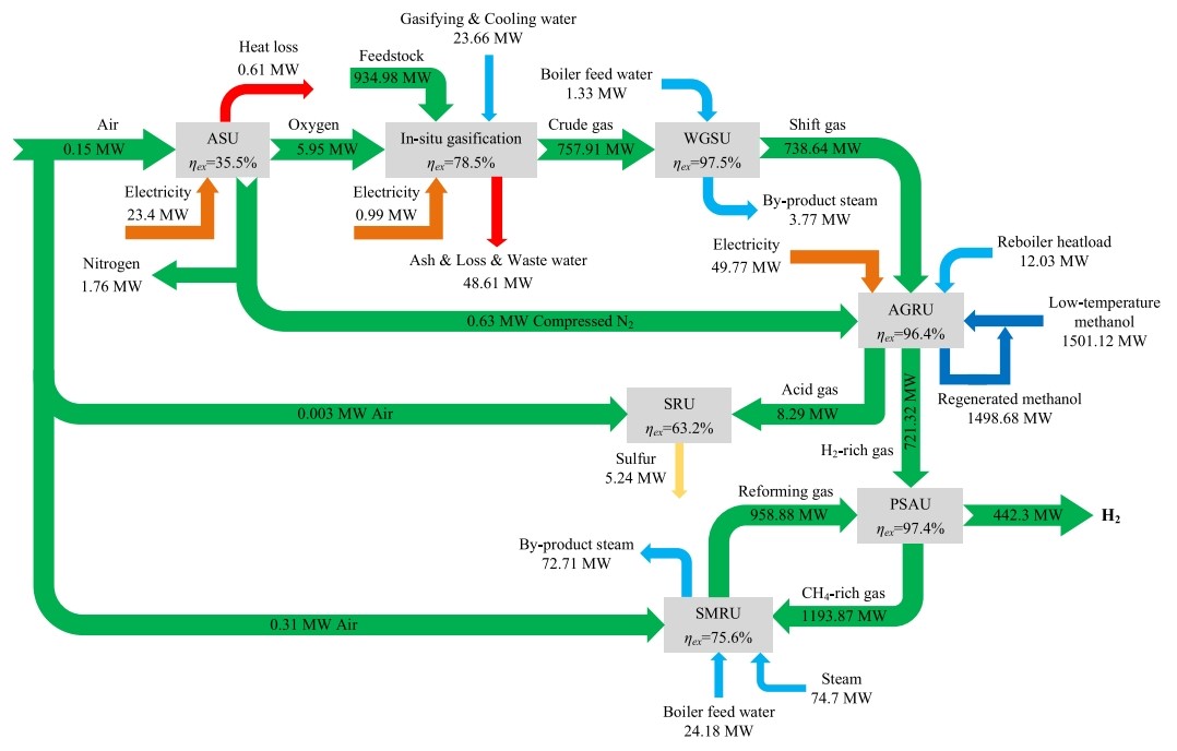 深部煤炭原位气化制氢作为一种潜在的规模化技术路线,工业化应用前利用热力学手段分析其能量转化、利用过程的特点,预测系统用能的薄弱环节,可为后续工艺过程、工艺参数耦合优化提供指导。与现有基于化石能源路线间效率、经济性等方面的定量化分析是提高竞争力,明确技术可行性与应用前景的核心关键。