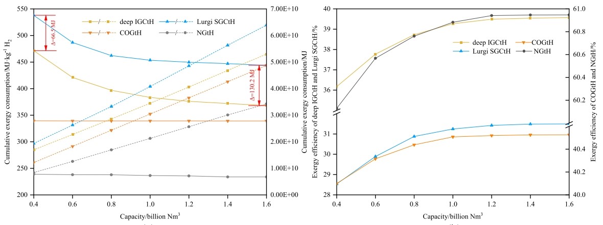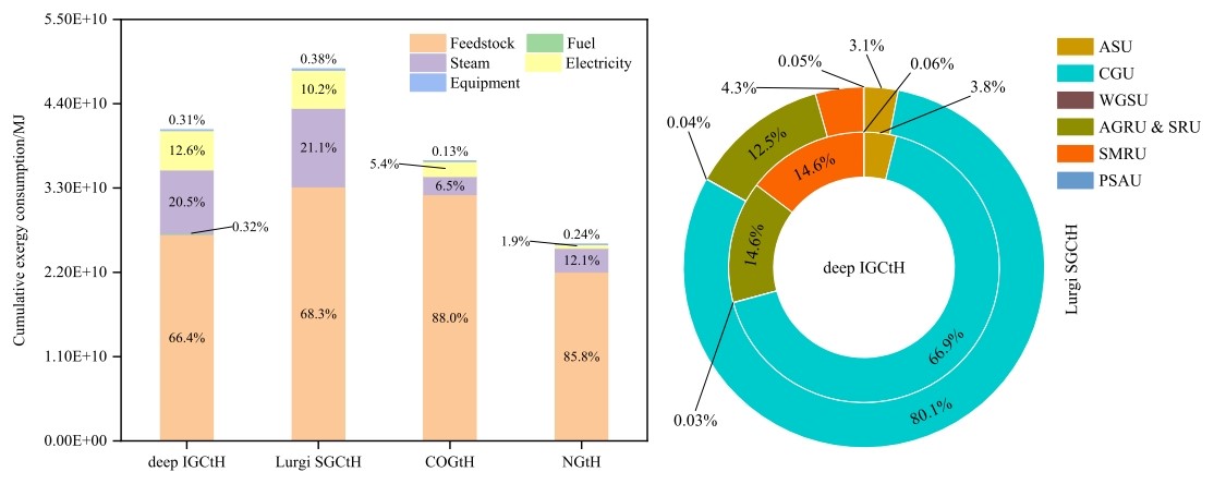 该成果基于世界上唯一的千米级深部煤炭原位气化试验数据,运用㶲分析方法,以㶲平衡方程为基础,结合过程模拟手段,计算了深部煤炭原位气化制氢从原煤开始到氢气产品产出的㶲损失、分布,将㶲损失细分为可避免/不可避免内部损失与可避免/不可避免外部损失四类,进一步分析用能薄弱环节,确定提高㶲效率的方法、手段。同时,针对传统㶲分析方法视角下效率指标存在㶲不等价与无法计入非连续投入能量等问题,创新提出以考虑设备因素的积累㶲消耗(CExC)作为衡量过程㶲效率的指标,据此明确深部煤炭原位气化制氢在效率方面的竞争力。结果表明,深部煤炭原位气化制氢㶲损失中存在39.9%的不可避免,而甲烷重整和深部地下气化具有最大的改进潜力,充分说明通过改进其他过程单元或优化工艺结构可实现热力学性能的改善。在产出每千克氢气时深部煤炭原位气化制氢的CExC仅为传统煤炭地面气化制氢的83.6%,表明其是一种更高效的路线,优势随着规模的增大会更加明显,同时投资、成本方面相比后者也具有显著优势。