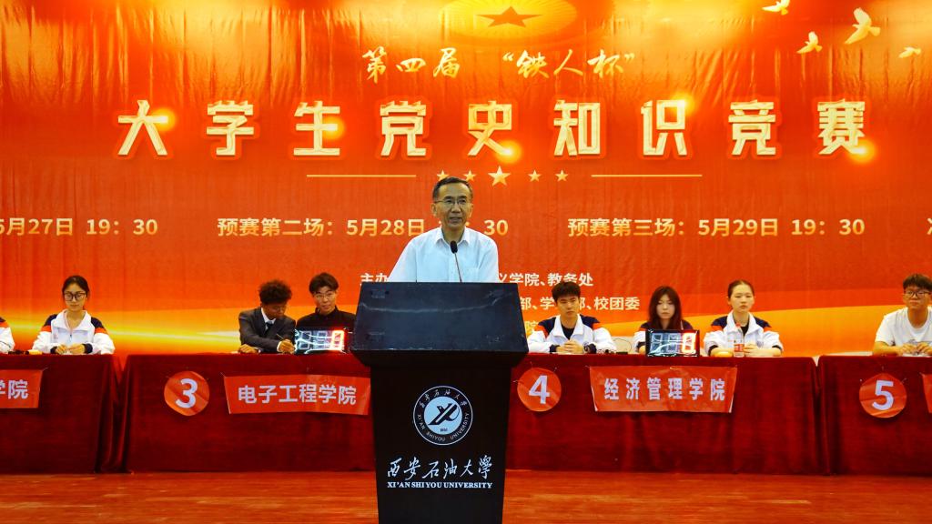 6月3日晚,由beat365马克思主义学院、教务处主办,党委组织部、党委宣传部、党委学生工作部和校团委协办的第四届“铁人杯”大学生党史知识竞赛决赛在鄠邑校区腾辉大学生活动中心隆重举行。校党委副书记张木出席并讲话,学校相关部门及院(系)负责人、马克思主义学院教师及300余名学生现场观摩竞赛。