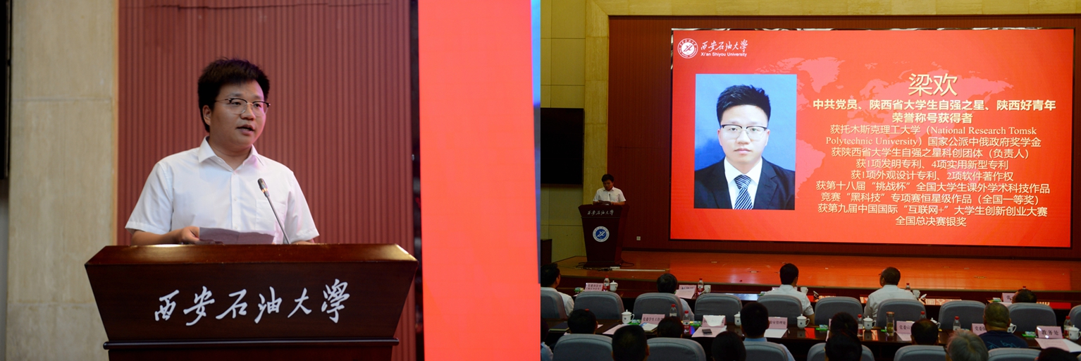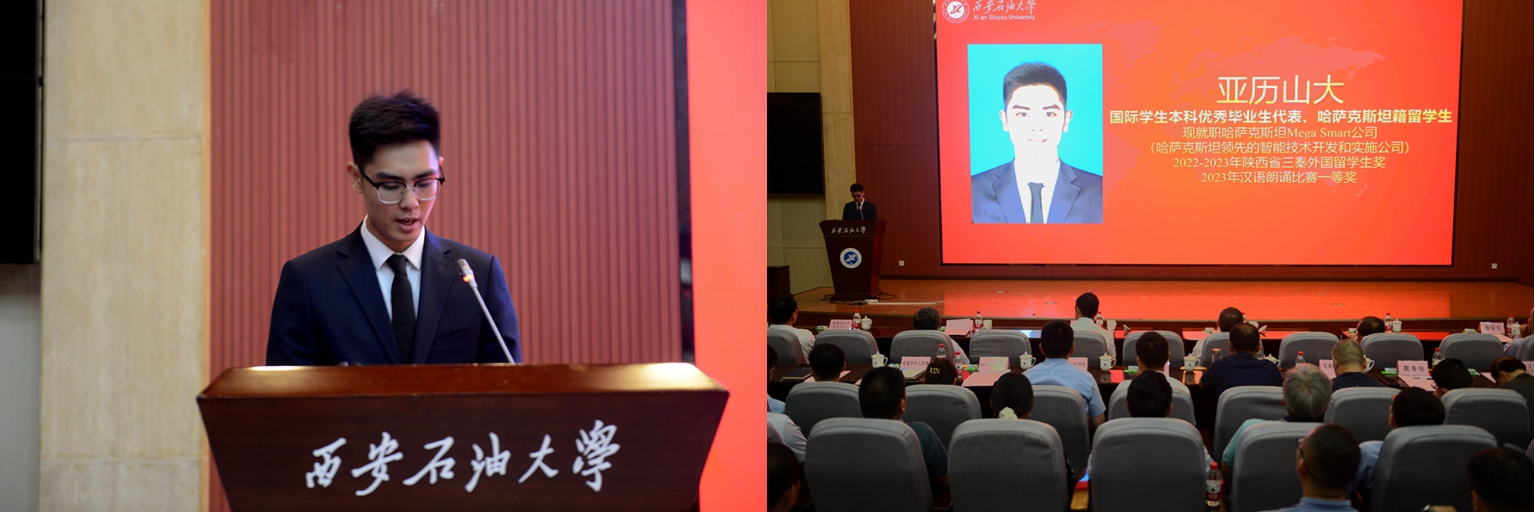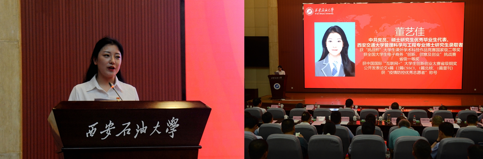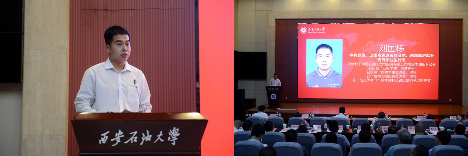 中共党员、陕西省大学生自强之星、陕西好青年荣誉称号获得者,石油工程学院学生梁欢;本科优秀毕业生代表、北京大学石油地质学专业硕士研究生录取者,地球科学与工程学院学生刘伟;国际学生本科优秀毕业生代表、哈萨克斯坦籍留学生,国际教育学院学生亚历山大;中共党员、硕士研究生优秀毕业生代表、西安交通大学管理科学与工程专业博士研究生录取者,经济管理学院学生董艺佳;中共党员、卫国戍边退役毕业生代表、西部基层就业优秀毕业生代表,石油工程学院学生刘国栋分别作了交流发言。