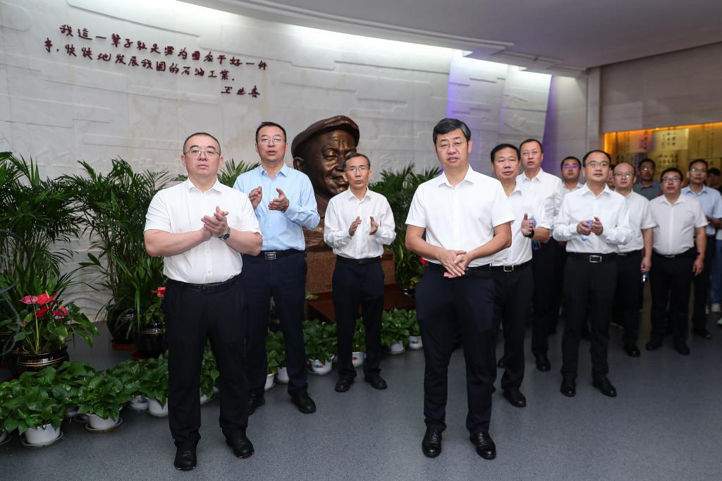 8月6日上午,常江、王进富一行参观了大庆油田铁人王进喜纪念馆,聆听铁人故事讲解,通过参观锈迹斑斑的文物、鲜活的老照片、写满文字的笔记本等陈列品,物见铁人本色、感受铁人精神。大庆钻探工程有限公司筹备组副组长、钻探工程公司总经理艾鑫全程陪同。