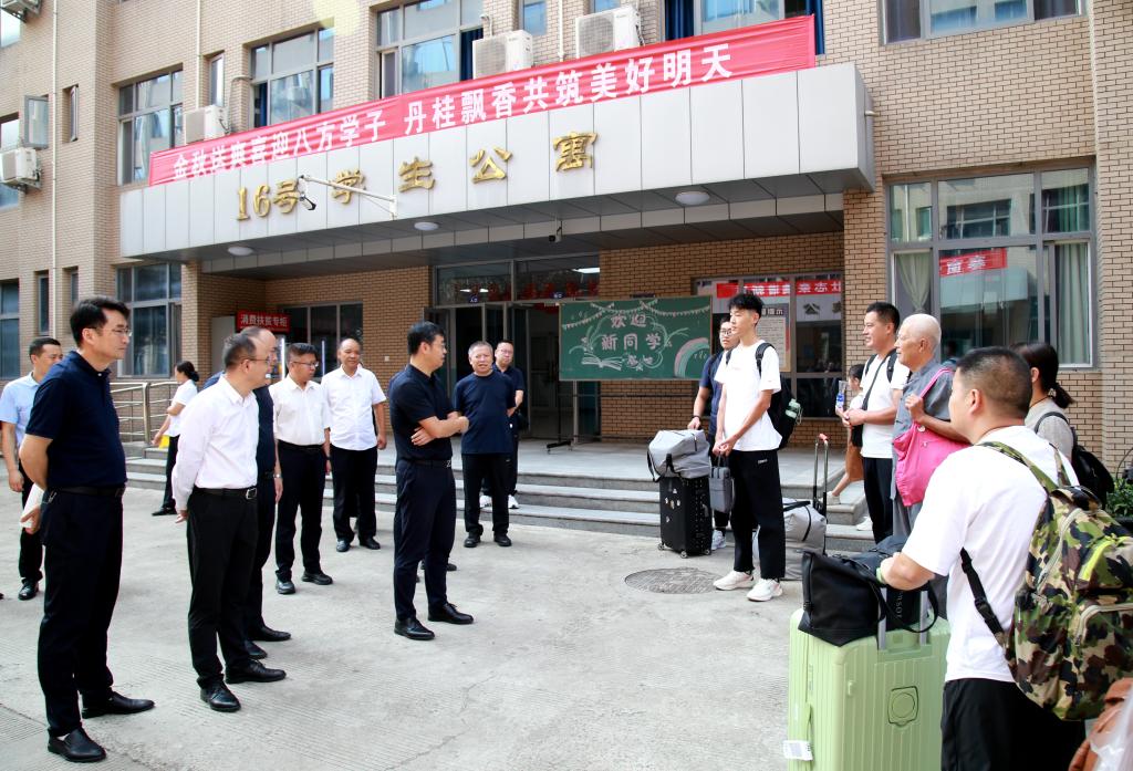 王进富带队走进东区15号和16号新生宿舍楼,听取了后勤处负责同志关于新生宿舍准备工作的汇报。在检查中他强调,宿舍的环境直接会影响到学生的学习和生活质量,后勤处等相关部门必须全力以赴为学生提供一个安全、舒适、卫生、便利的居住环境。检查中,王进富和宿舍楼前偶遇的新生及家长进行了亲切交谈,并合影留念。