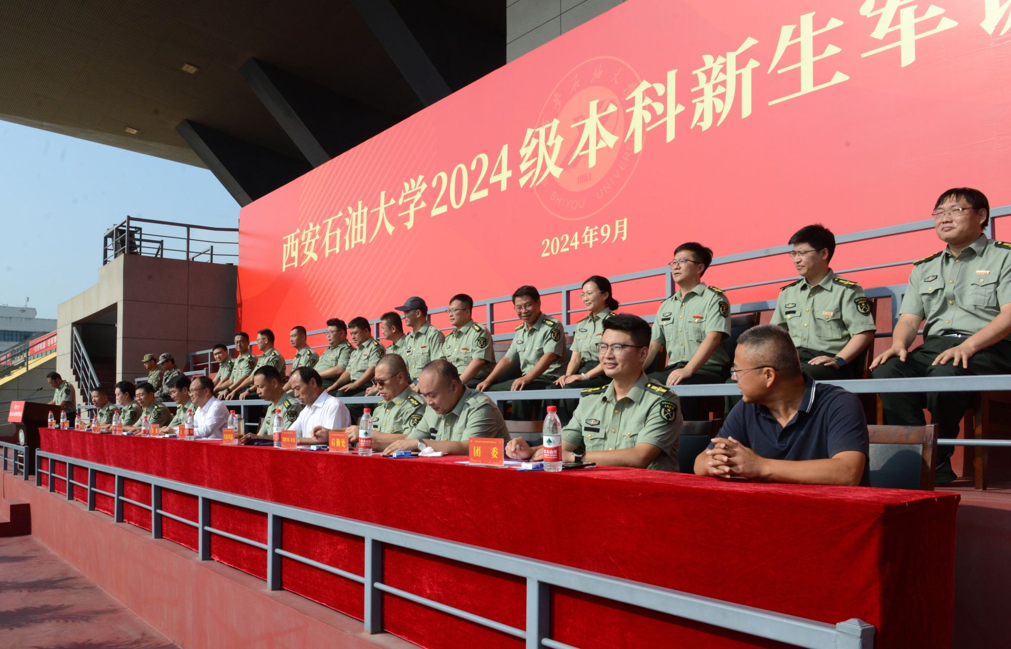 9月4日上午,beat365官方网站2024级本科新生军训动员大会在鄠邑校区东田径场举行。军训领导小组组长、副校长赵健,中国人民解放军某部队王林上校出席大会。党委办公室(校长办公室)、宣传部、学生工作部(处)、保卫部(处)、团委、教务处、后勤处、校医院等相关部门负责人,全体参训学生工作干部以及2024级全体本科新生参加大会。