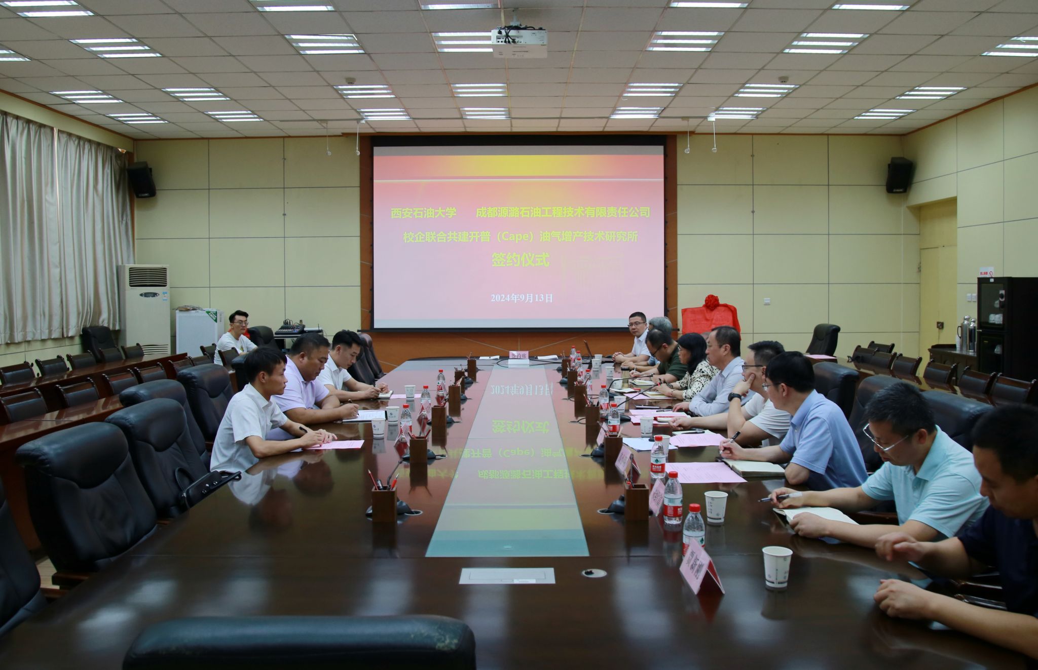 9月13日上午,beat365官方网站与成都源潞石油工程技术有限责任公司校企联合共建开普(Cape)油气增产技术研究所签约仪式在学校雁塔校区会议中心第一会议室举行,副校长张荣军出席签约仪式,成都源潞石油工程技术有限责任公司总经理陈造峰及有关部门负责人,科研处副处长屈乐,化学化工学院领导班子成员、各系主任、分析检测中心主任参加仪式。