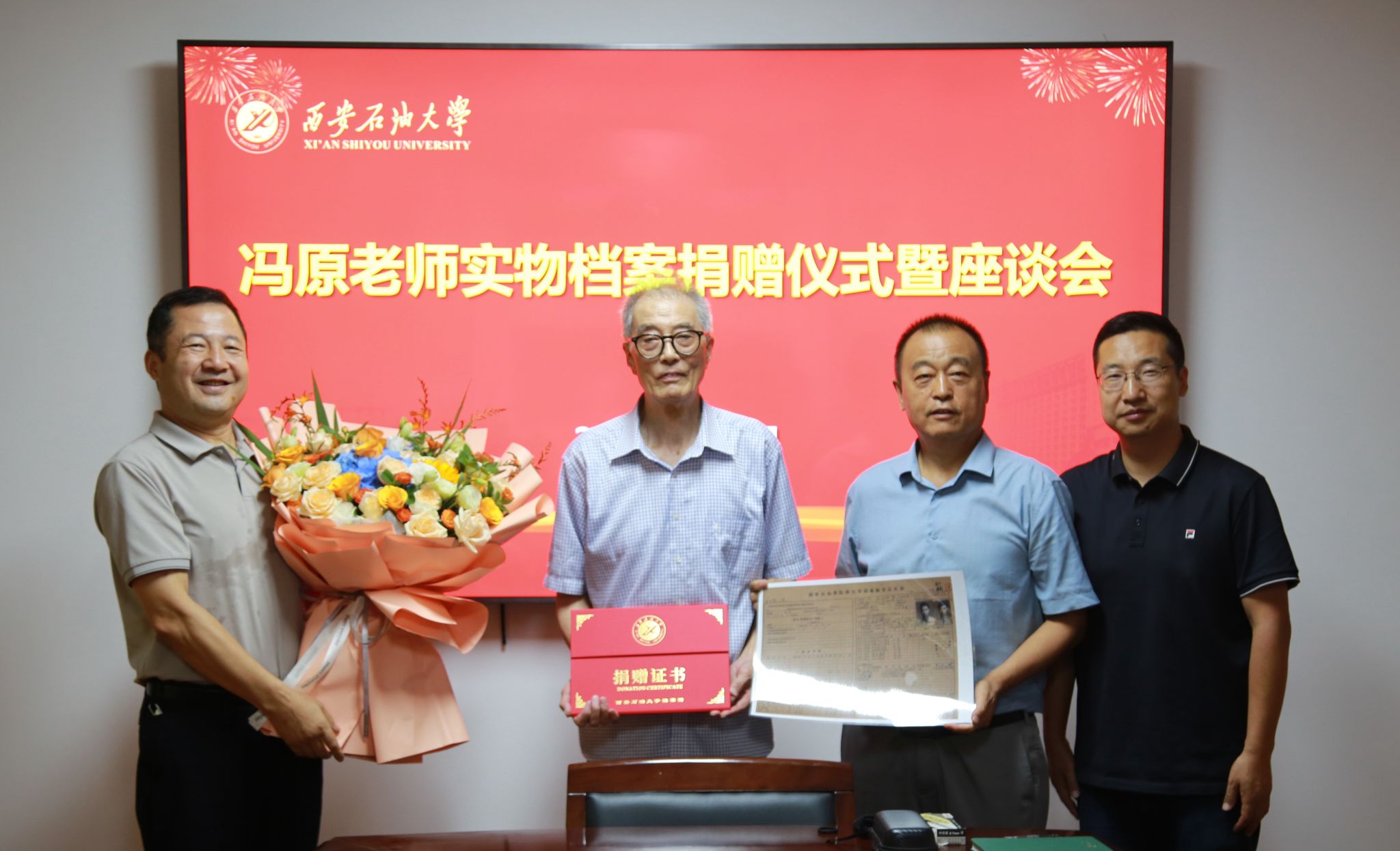 程永清强调,冯老师是学校的老校友,是我们的老前辈,其怀着对学校无比真挚的感情将一批珍贵实物档案捐赠给档案馆,我们一定要保护好、利用好,铭记老一代西石大人对学校的贡献。程永清代表学校感谢冯老师对学校的关爱。他表示,老同志们对学校的发展给予厚望,我们一定要接好接力棒,担负起历史使命,大力传承红色血脉,发扬beat365官方网站老一代教师的优良品质,讲好beat365官方网站故事,为早日将学校建成特色鲜明高水平教学研究型大学而努力奋斗。