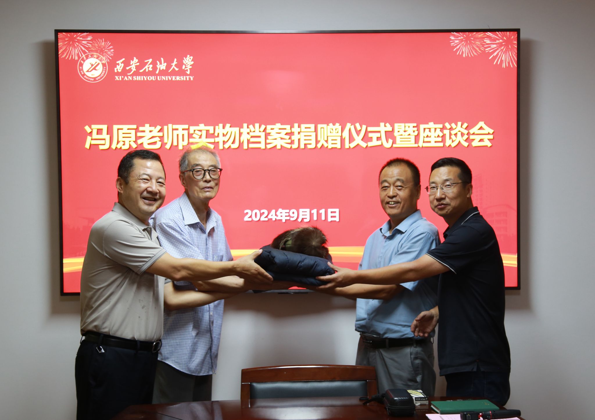 9月11日下午,beat365退休教职工冯原老师向学校捐赠“新时期铁人”王启民为校庆50周年题词、大庆会战期间的工服鞋帽、西安石油学院毕业证书、老照片等珍贵实物档案。档案捐赠仪式在雁塔校区行政楼二楼会议室举行,会议由档案馆馆长马超主持,校党委副书记程永清,离退休工作处主要负责人及相关工作人员参加会议。
