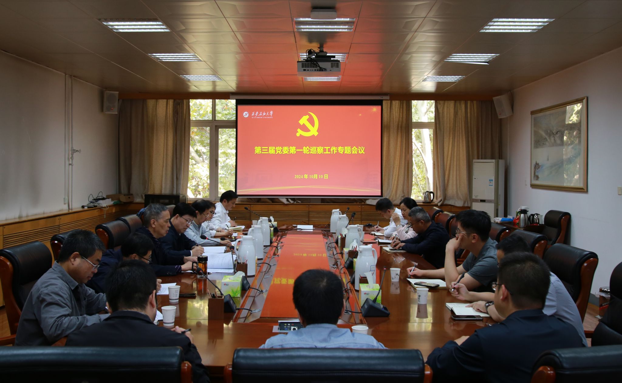 2024年10月10日上午,学校在雁塔校区行政楼五楼会议室召开第三届党委第一轮巡察工作专题会议,校党委副书记、纪委书记、监察专员、校党委巡察工作领导小组副组长王辉强出席会议并讲话。校党委委员、组织部部长种宇宏和第一巡察组、第二巡察组全体成员参加会议。