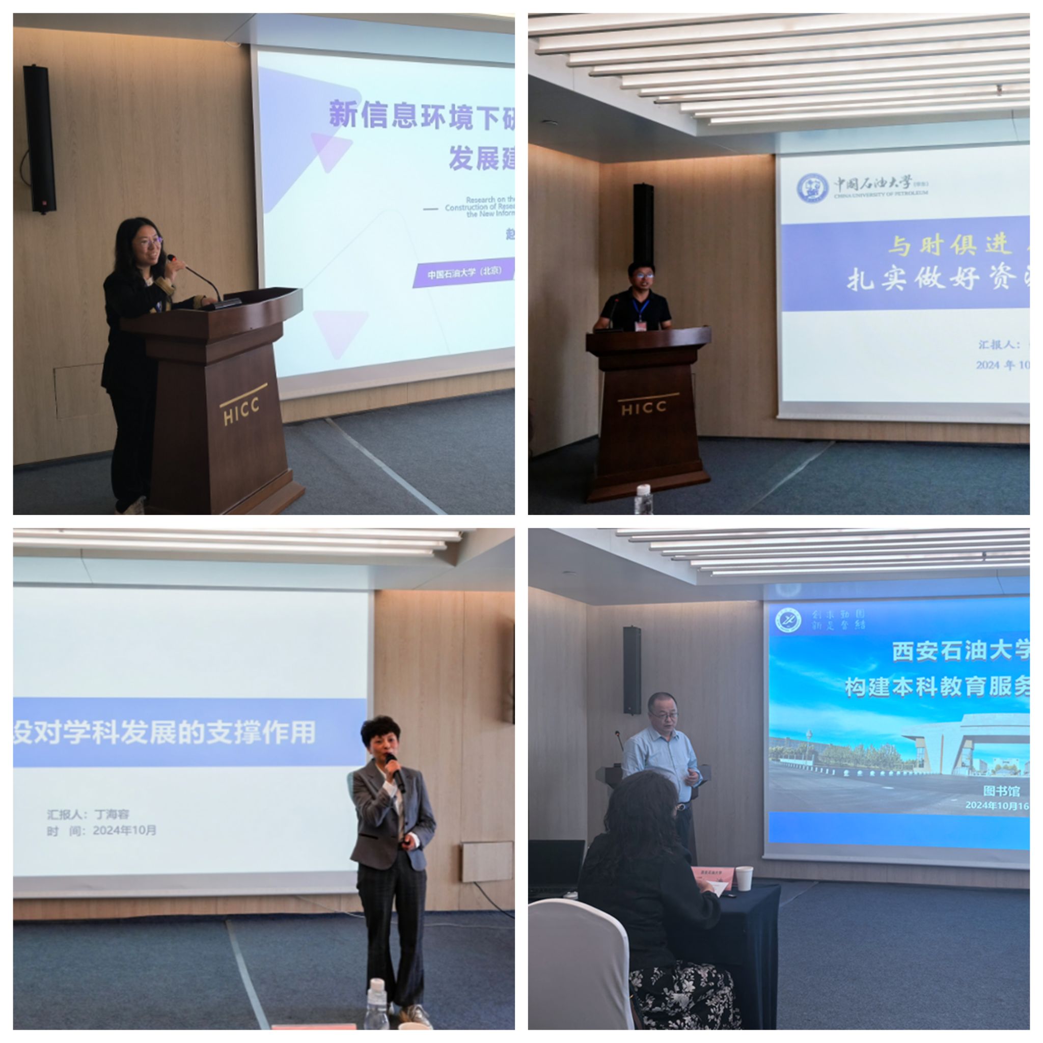 中国石油大学(北京)图书馆副研究馆员赵天姿、中国石油大学(华东)图书馆资源建设部主任张雪松、成都理工大学图书馆副馆长丁海容、beat365图书馆副研究馆员史启明,分别以“新信息环境下研究型大学图书馆发展建设研究”“与时俱进顺势而为扎实做好资源建设工作”“文献资源建设对学科发展的支撑作用”“新时代高校图书馆构建本科教育教学服务体系的探索”为题,作了精彩的学术报告。