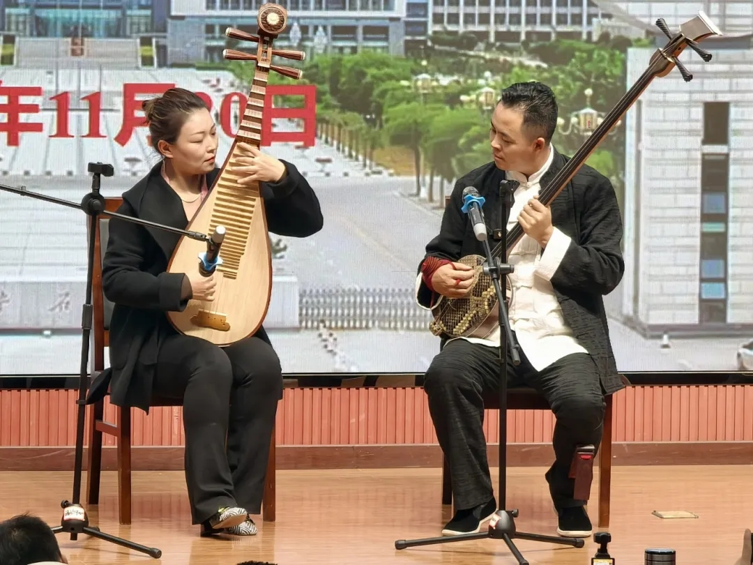 在报告环节,音乐系副主任张帆作为主讲,从陕北说书的起源传说、艺术特征、代表书匠、重要节点、机遇挑战等五个方面作了专题背景介绍,并与熊竹英联袂演奏了《南泥湾》。