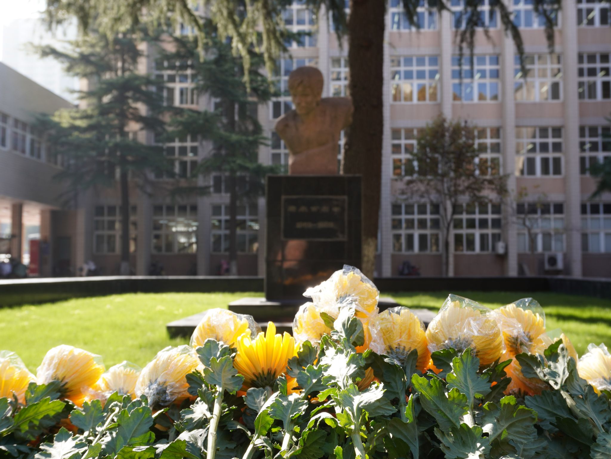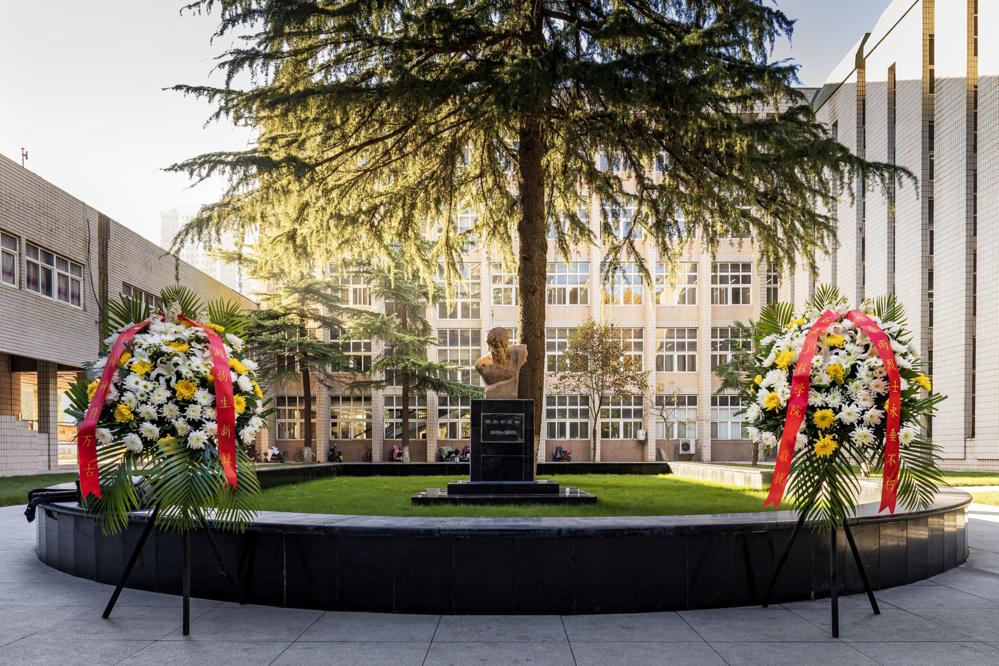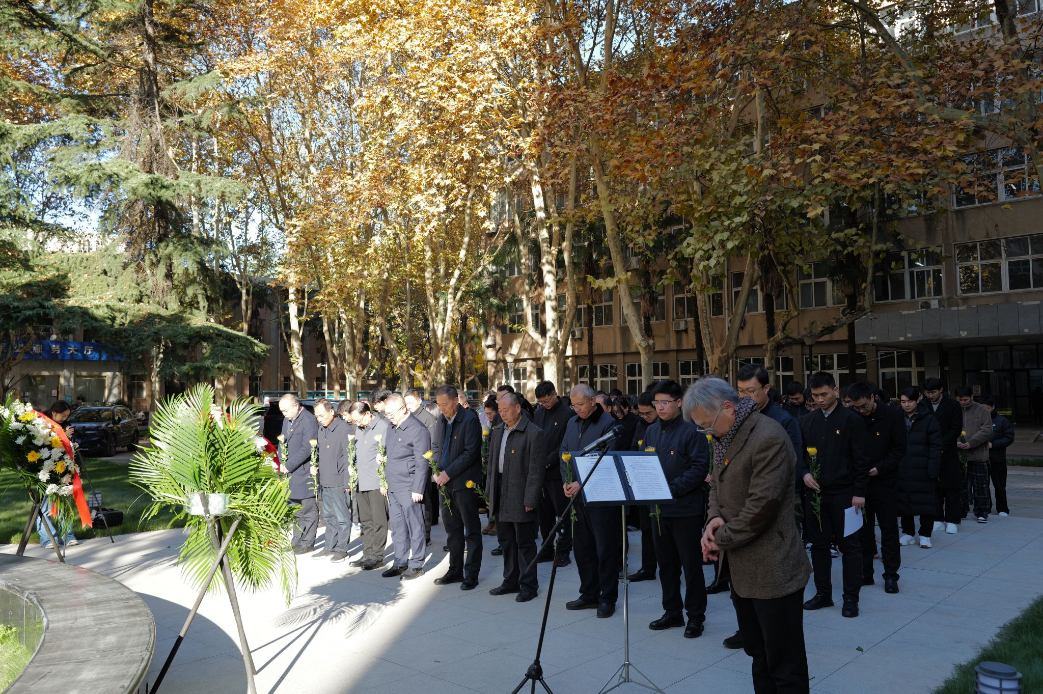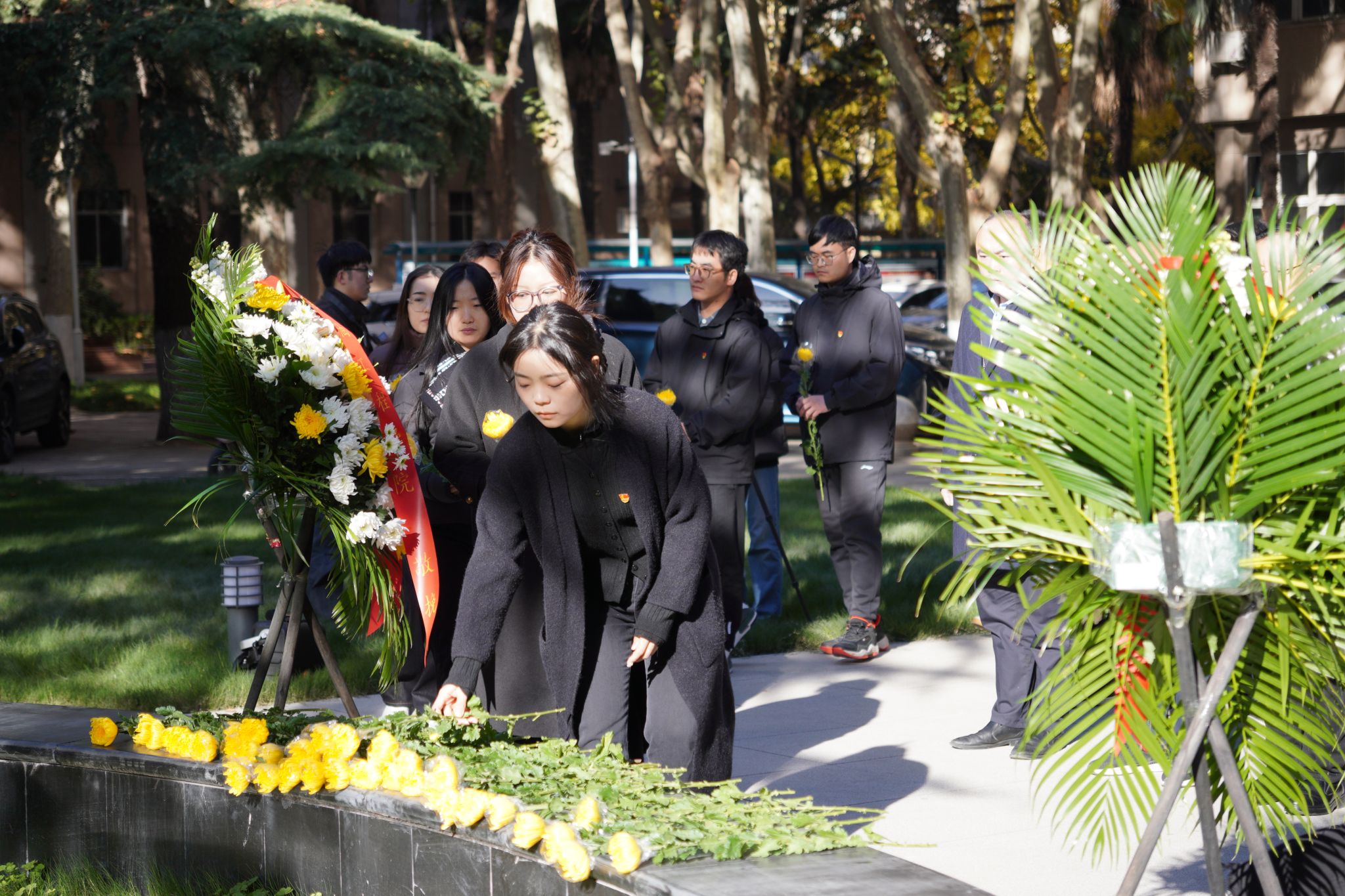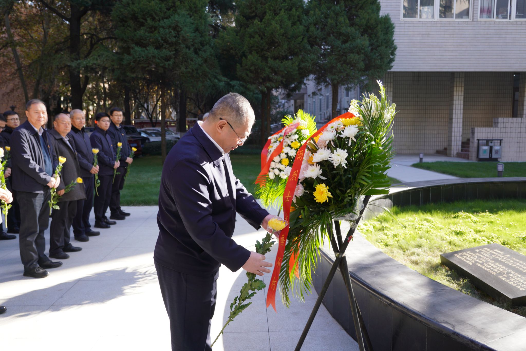 阳光照耀下的唐春雨烈士塑像庄重祥和。全体师生瞻仰唐春雨烈士塑像,默哀一分钟。常江缓步向前整理了花圈挽联,随后全体师生依次向唐春雨烈士敬献鲜花,鞠躬致敬。