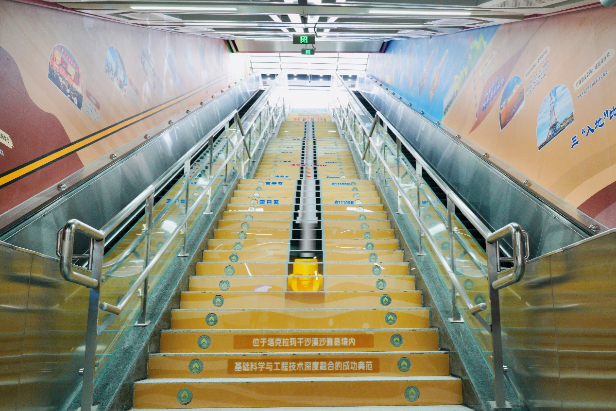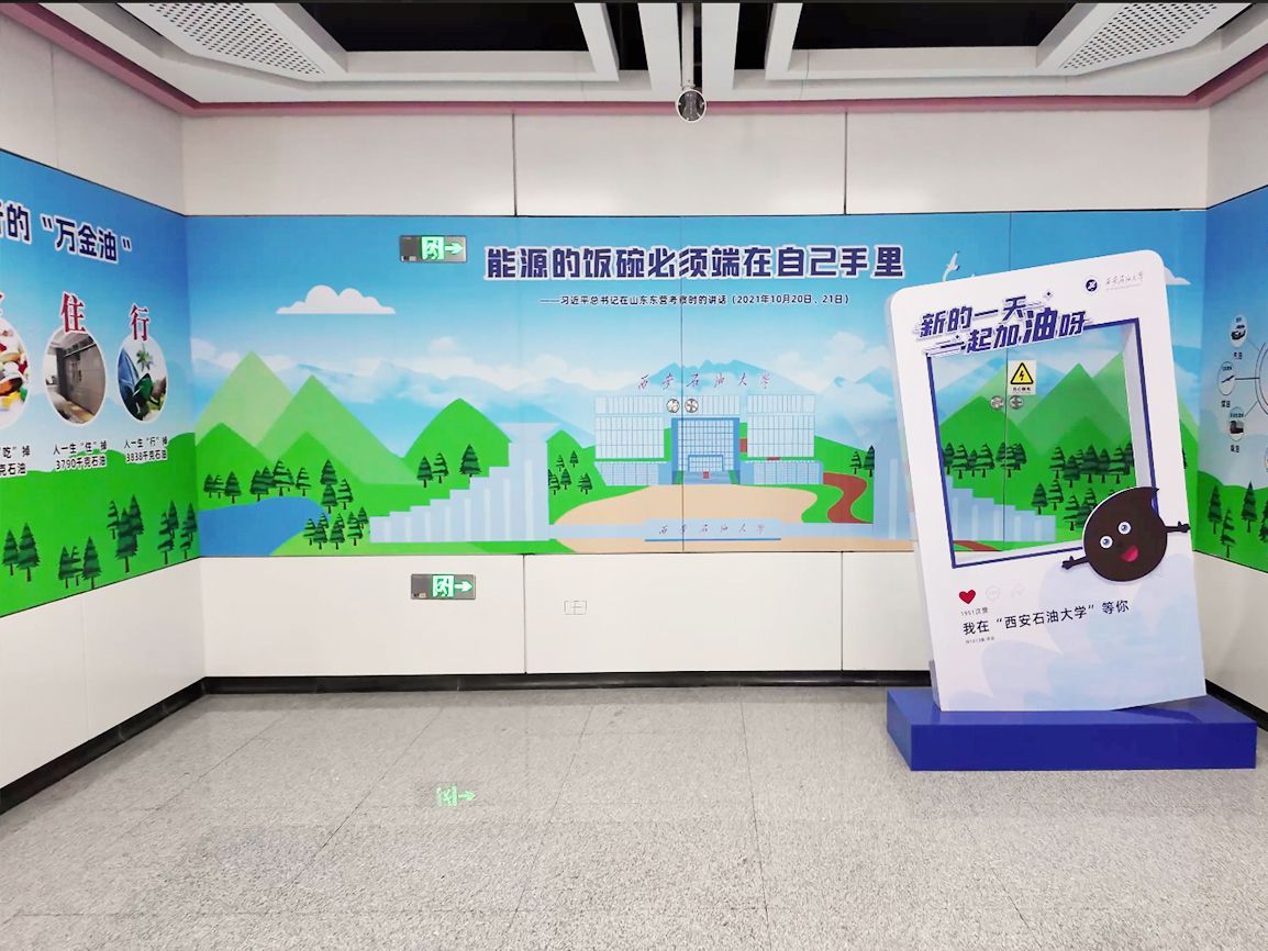 全部布展区域约102米,以模拟地下开采环境为背景,结合进出站行进路线,规划了“七个场景”的布展内容:1号墙“工业血液——中国石油工业的奋进篇章”,依托进站下行扶梯,再现了石油的最早记录和中国石油工业从起步到壮大的辉煌历程,展示了我国在石油技术、装备、合作等领域的新突破;2号墙“石油七十二变”,依托长廊侧面,展示了石油在生产生活中的具体应用场景;3号墙依托出站时映入眼帘的正面墙,展示了习近平总书记关于国家能源安全的重要论述,同时融入beat365鄠邑校区经典元素剪影(北大门、图书馆、终南山);4号墙“衣食住行的万金油”,依托进站下楼时首先映入眼帘的正面墙体,以趣味数字量化人们在生活中使用的石油;在4号墙远端,强调展出了“为祖国加油、为民族争气”和“石油精神办学 铁人精神育人 延安精神铸魂”的理念;5号墙“西石大智慧”是离出站口最近的必经墙体,展示了beat365优秀科研成果服务国家重大应用场景;6号墙“油气产业链全景探索”,依托出站上行扶梯墙体,对油气产业上中下游进行了全阶段科普展示;最后,利用出站楼梯的侧立面,立体展示了亚洲第一最深直井、我国首口万米科探井(深地塔科一井)的探地效果和地球的年代地层。