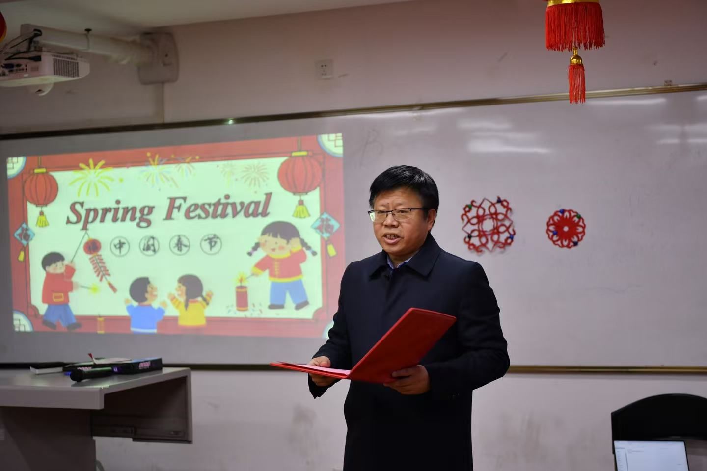 张骁勇发表新年致辞,向寒假期间留校的国际学生送上了诚挚的新春祝福。他指出,国际学生作为文化交流使者的重要性,在华感受新春民俗,鼓励他们在新的一年里继续探索中国文化,积极参与学校和社会的各项实践活动。