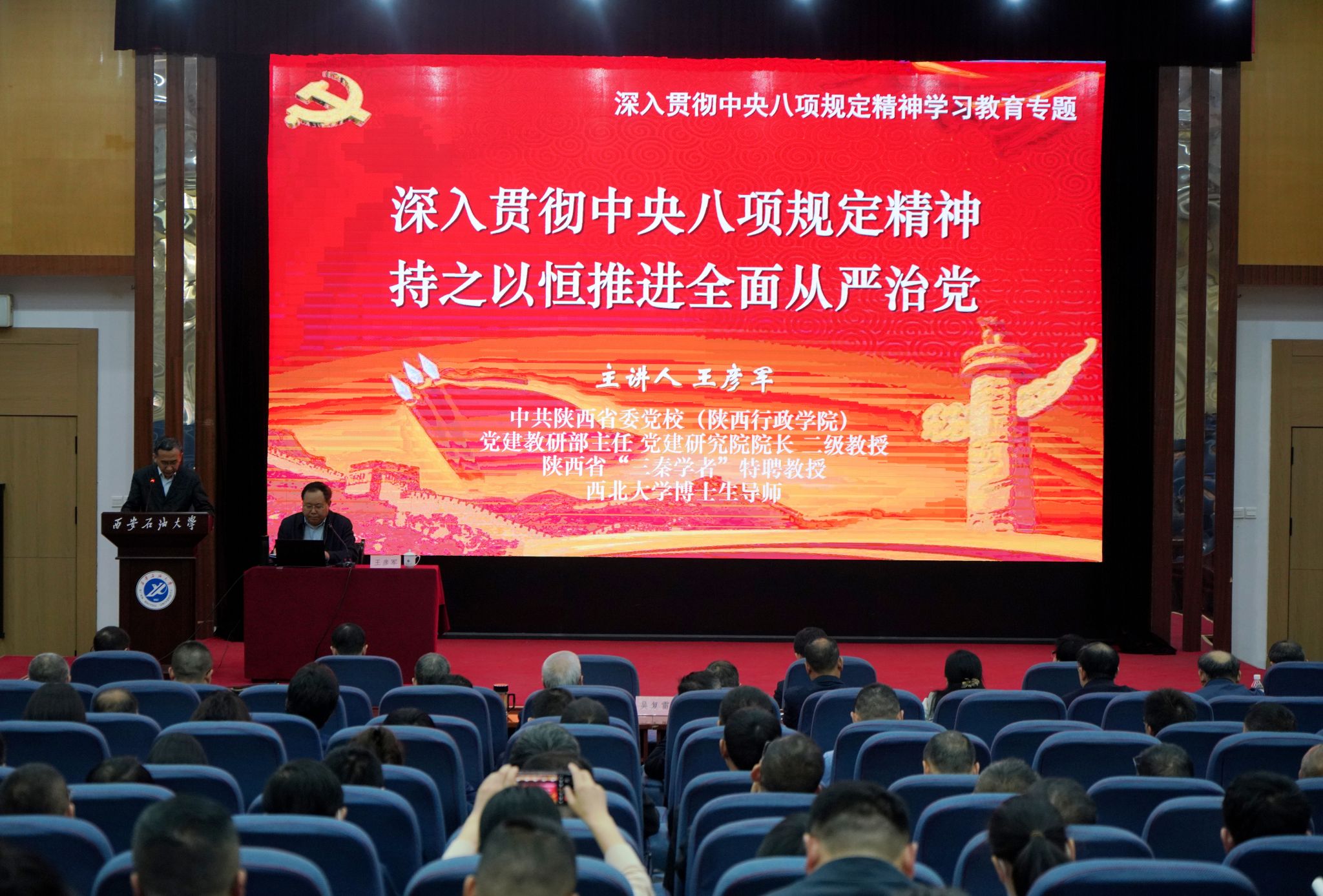 会上,王彦军教授以《深入贯彻中央八项规定精神持之以恒推进全面从严治党》为题,深入剖析了深入贯彻中央八项规定精神学习教育的时代背景,阐明了党的十八大以来以习近平同志为核心的党中央围绕保持党同人民群众的血肉联系,锲而不舍落实中央八项规定强化纪律约束的重要性和迫切性。从厉行勤俭节约、反对奢侈浪费和奢靡之风、廉洁从政以及工作作风务实等方面全面论述了中央八项规定及其精神的主要内容,细致梳理了习近平总书记关于作风建设的重要论述,结合深入浅出的实例深刻解析了新时代党的作风建设“为什么抓”“抓什么”“怎么抓”的根本方向性问题,进一步廓清了学习教育推动管党治党走深走实的重要意义。