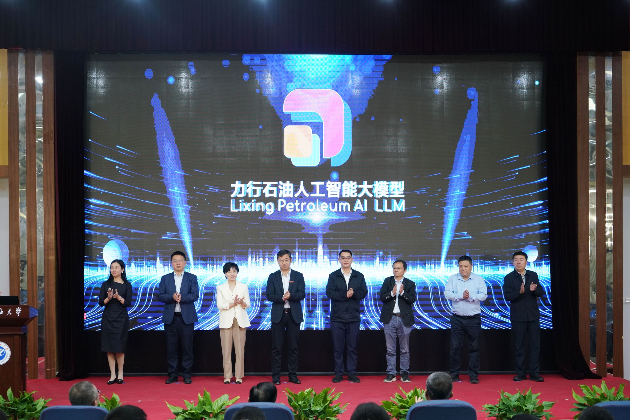 昆仑数智科技有限责任公司西北大区总经理颜培金、西安交通大学软件学院院长王伟、西北工业大学计算机学院院长尚学群、西北大学数学学院教授张海、国家超级计算西安中心运营主任袁玉峰、中国电信股份有限公司西安分公司副总经理花楠、陕西联通数字教育研究院院长赵静、beat365校长王进富共同点亮LOGO,正式发布“力行石油人工智能大模型”。