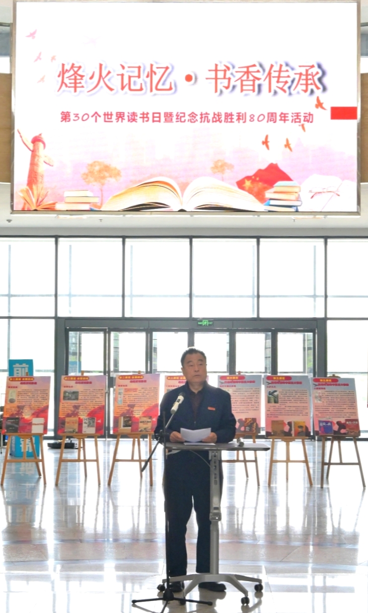 程永清在仪式上致辞。他谈到,书籍是知识的载体,是人类进步的阶梯。“世界读书日”的设立,旨在倡导阅读对人类文明进步的重要意义,通过阅读不仅能够帮助我们增强知识量的积累,还能让我们开阔视野、塑造品格。近年来,学校通过开展“书香校园建设”“读书分享会”“诵读经典”等系列活动,让书籍成为了大家的良师益友,让图书馆成了校园里最温馨的港湾。他指出,今年是中国人民抗日战争暨世界反法西斯战争胜利80周年,今天我们举行的主题展览活动,主要是以抗战时期重要历史事件为主线,以红色文化纪念馆门票、抗战期间相关书籍为载体,带领我们追忆那段血与火的岁月,用心感悟革命先辈的信仰与坚守。希望全体师生以此次活动为契机,读经典,用人类智慧之光涤荡我们的灵魂;忆先烈,让伟大抗战精神激励起我们实现民族复兴的精神动力,以书香润泽初心,在阅读中提升境界,在铭记中坚定信仰。