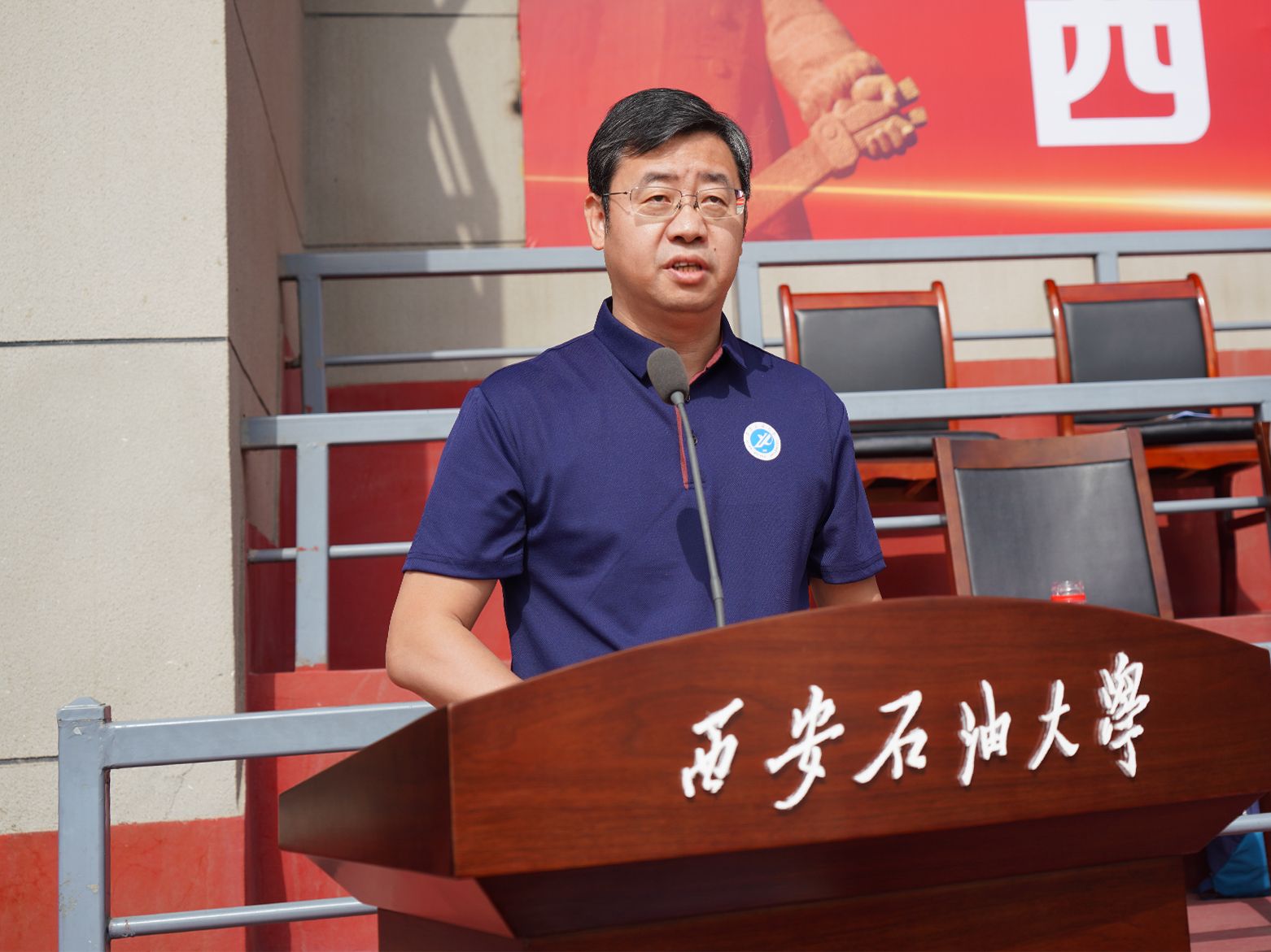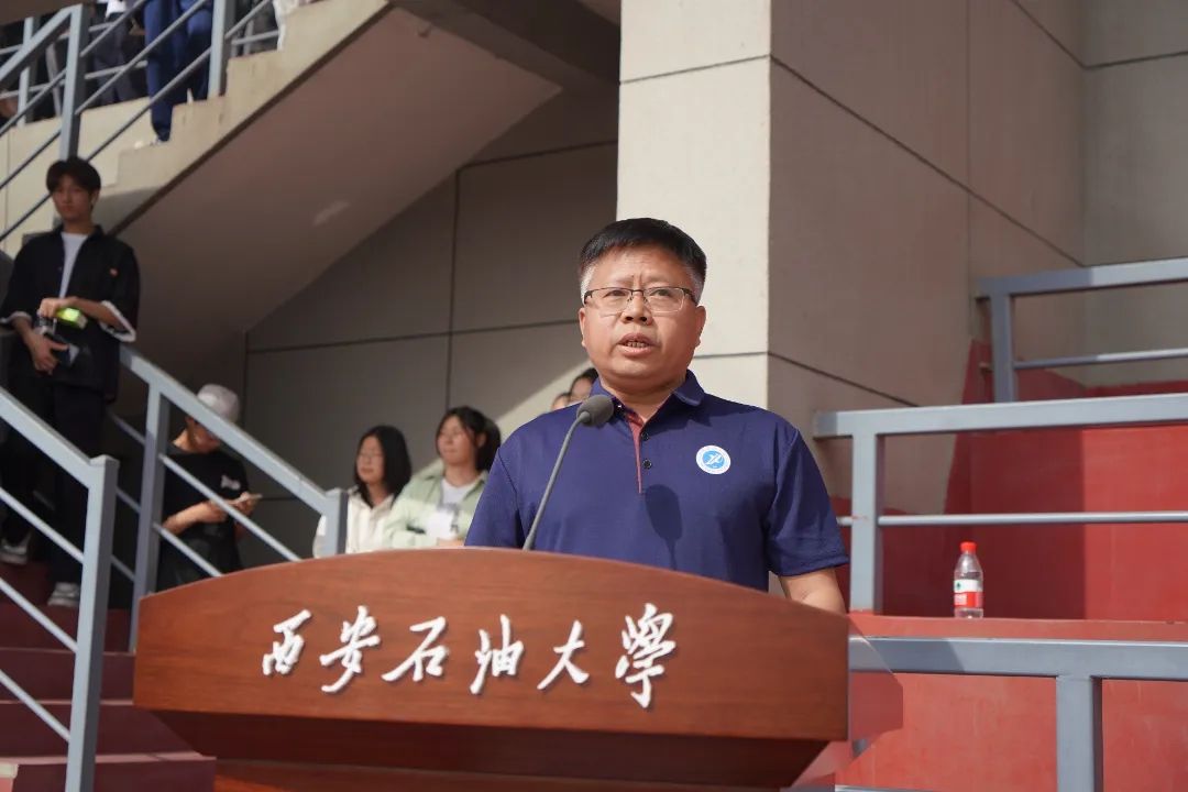 校长王进富代表学校致开幕词。他向全体运动员、裁判员及工作人员致以崇高敬意,并回顾了过去一年学校体育事业的丰硕成果。他指出,从“三动计划”点燃校园运动热潮,到环校马拉松2112名师生用脚步丈量能源热土;从校运会刷新3项历史纪录,到竞技团队勇夺48项省级荣誉、首摘全国桨板联赛金牌;从“陕西省排球训练基地”挂牌到武术短兵培训,西石大人始终以体育精神铸魂育人,以实干担当服务社会,书写了践行“健康中国”战略的生动篇章。