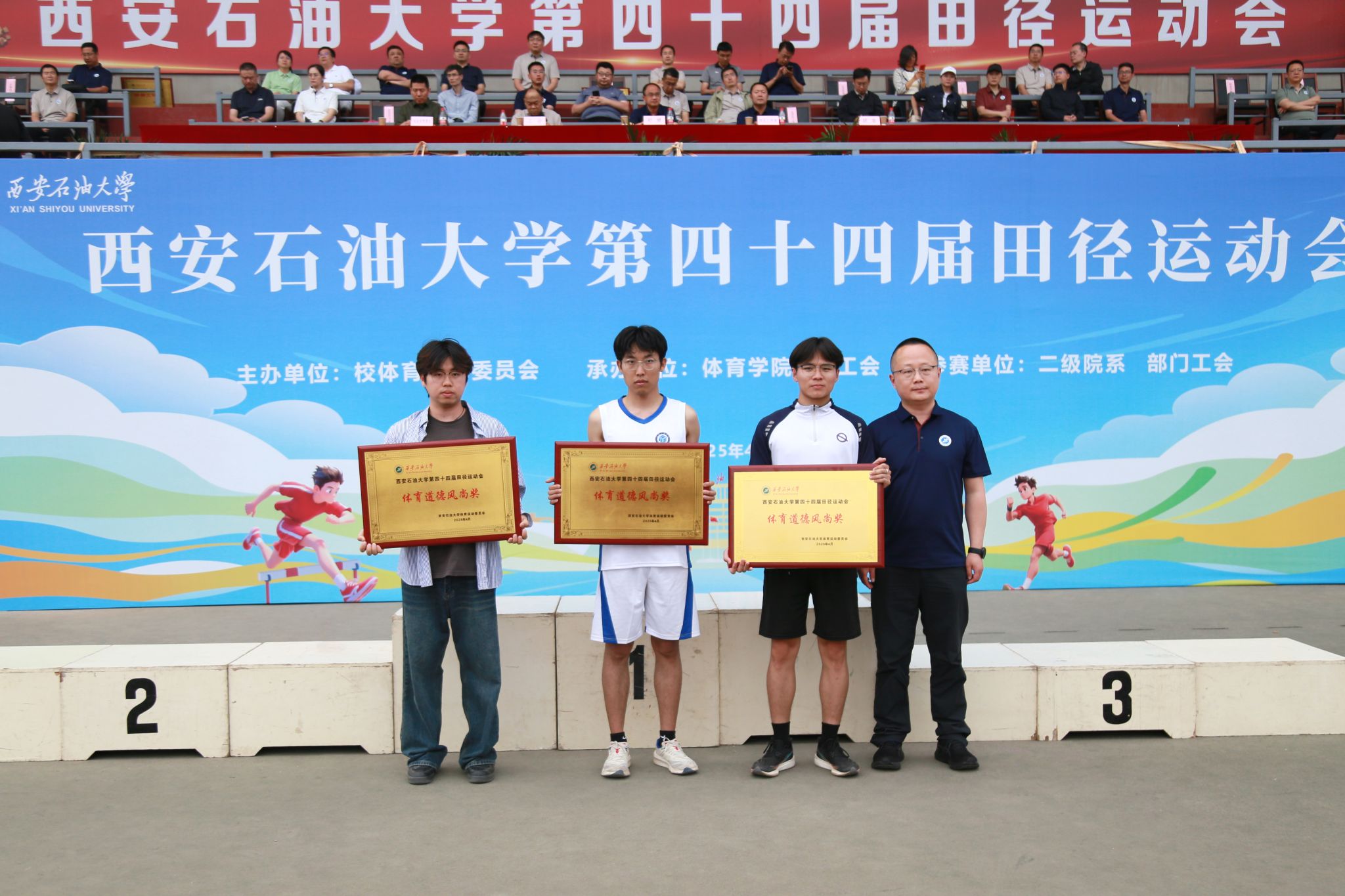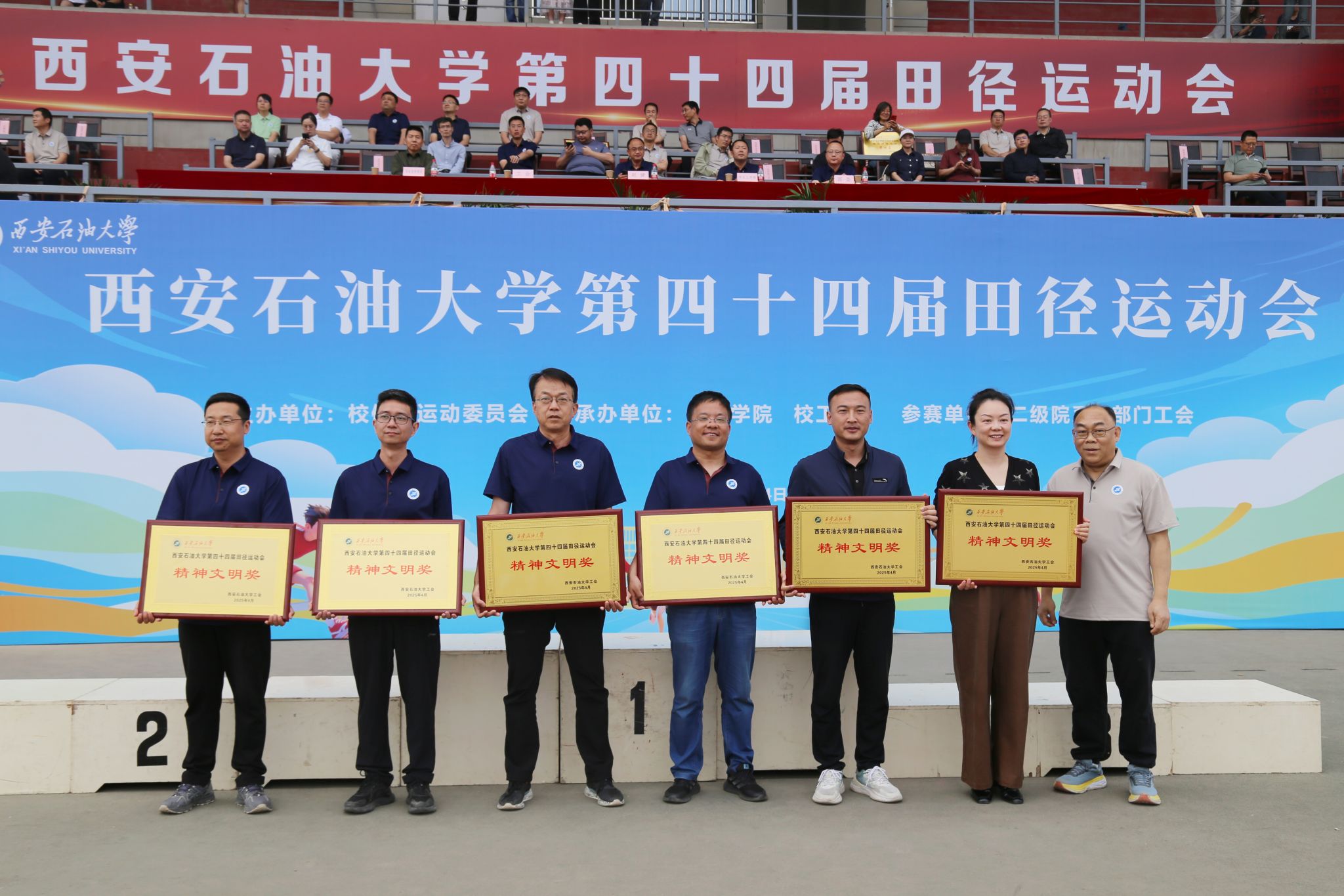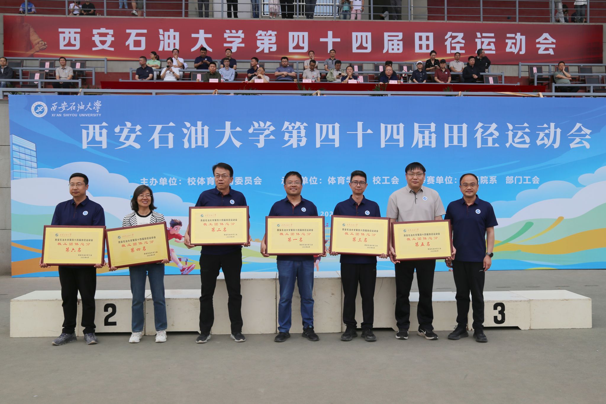 在本届运动会中,教职工们挥洒汗水、奋勇争先,既摘得了荣誉之果,又收获了同事之间的默契;学生们秉持“友谊第一,比赛第二”的体育精神,在拼搏中奔跑,在掌声中成长,书写下属于西石大青年的高燃瞬间。经过两天有条不紊,紧张激烈的比赛,本届田径运动会圆满完成了各项预定赛程,教职工比赛和学生比赛分别取得了优异成绩。其中,后勤工会,经济管理学院工会,石油工程学院工会,人文学院工会,理学院工会,直属部门/离退休工会获得教职工团体总分前六名;后勤工会,石油工程学院工会,经济管理学院工会,直属部门/离退休工会,人文学院工会,机关二工会获得精神文明奖。机械工程学院、经济管理学院、石油工程学院获得学生男子团体总分前三名;经济管理学院、机械工程学院、石油工程学院获得学生女子团体总分前三名;经济管理学院、机械工程学院、石油工程学院、电子工程学院、地球科学与工程学院、化学化工学院获得学生男女团体总分前六名;经济管理学院、外国语学院、机械工程学院获得体育道德风尚奖。特别是体育学院的李佳敏同学打破了学校女子100米和200米记录。