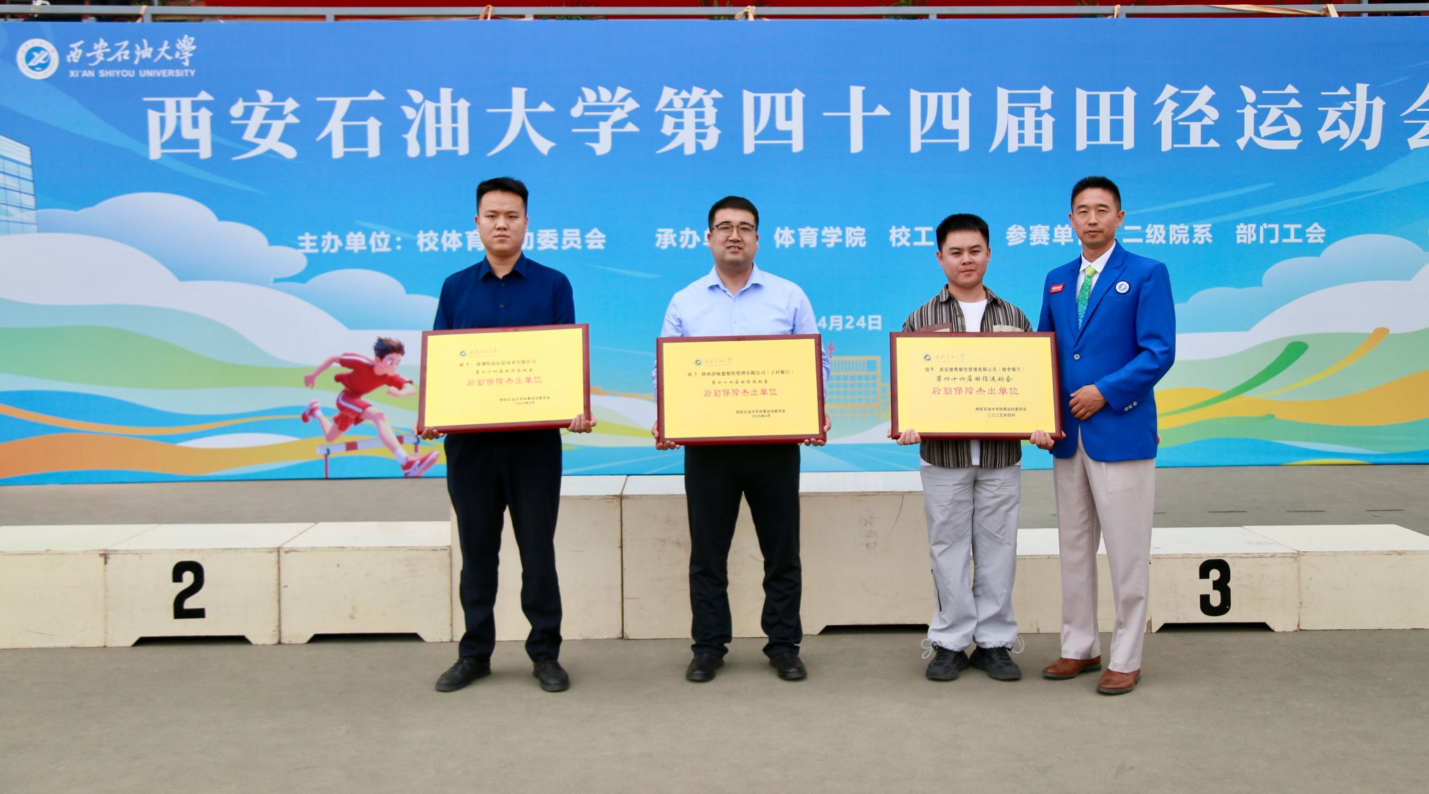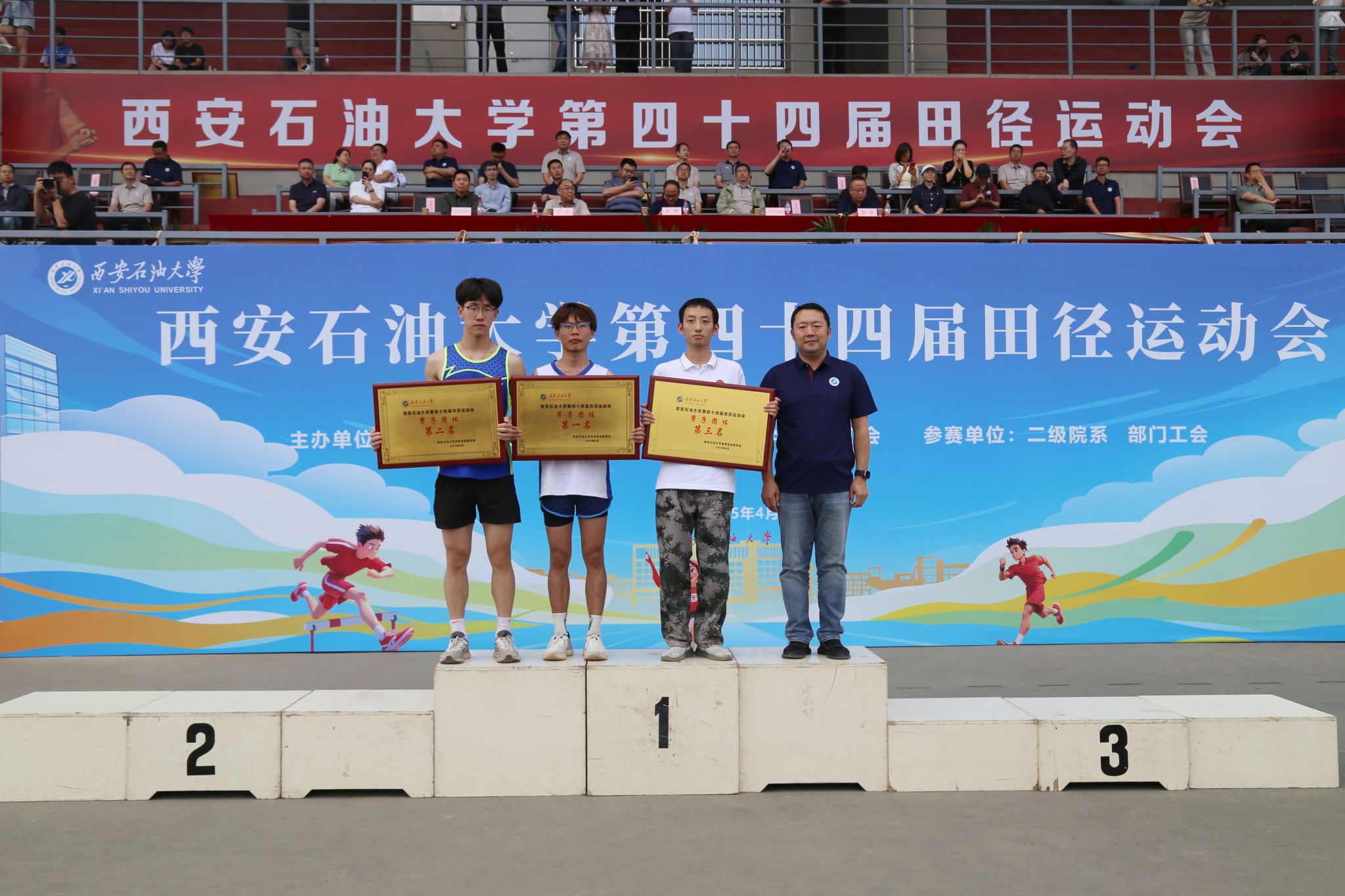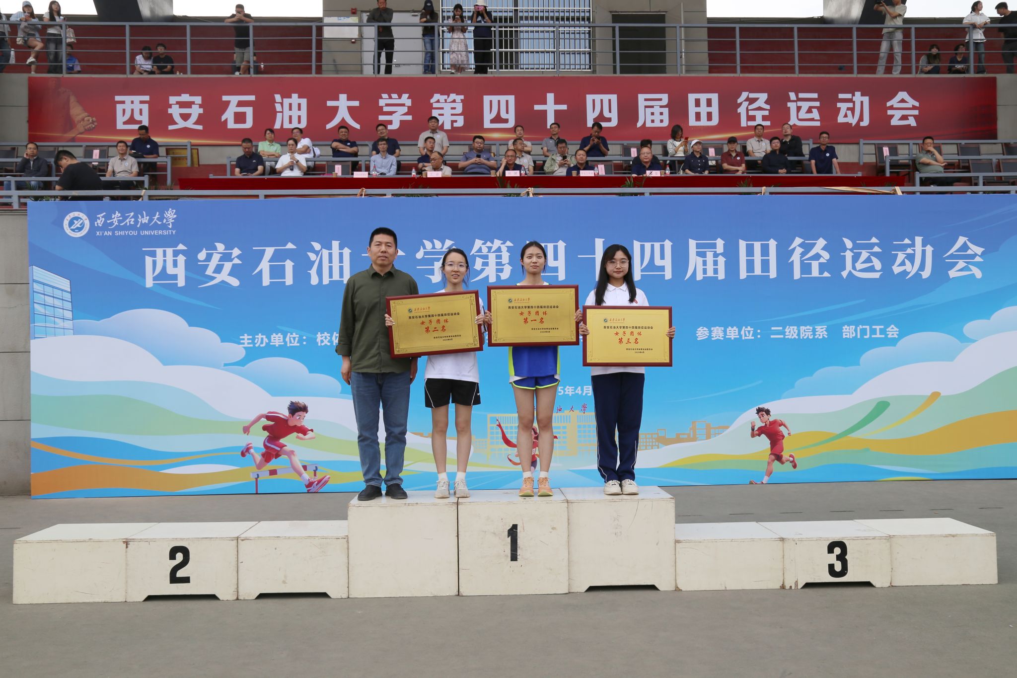 在本届运动会中,教职工们挥洒汗水、奋勇争先,既摘得了荣誉之果,又收获了同事之间的默契;学生们秉持“友谊第一,比赛第二”的体育精神,在拼搏中奔跑,在掌声中成长,书写下属于西石大青年的高燃瞬间。经过两天有条不紊,紧张激烈的比赛,本届田径运动会圆满完成了各项预定赛程,教职工比赛和学生比赛分别取得了优异成绩。其中,后勤工会,经济管理学院工会,石油工程学院工会,人文学院工会,理学院工会,直属部门/离退休工会获得教职工团体总分前六名;后勤工会,石油工程学院工会,经济管理学院工会,直属部门/离退休工会,人文学院工会,机关二工会获得精神文明奖。机械工程学院、经济管理学院、石油工程学院获得学生男子团体总分前三名;经济管理学院、机械工程学院、石油工程学院获得学生女子团体总分前三名;经济管理学院、机械工程学院、石油工程学院、电子工程学院、地球科学与工程学院、化学化工学院获得学生男女团体总分前六名;经济管理学院、外国语学院、机械工程学院获得体育道德风尚奖。特别是体育学院的李佳敏同学打破了学校女子100米和200米记录。
