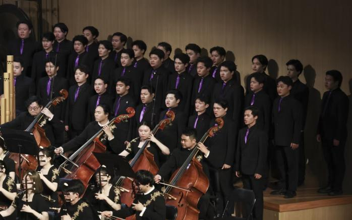 《丝路之声》由“金钟奖”作品奖得主、青年作曲家王云飞倾力创作,一级指挥、中央民族乐团首席指挥刘沙执棒首演。本场演出集百名演奏家的物理规模、多元乐器的文化纵深、顶尖艺术家的技术高度,集“器、乐、情”于一体,完成对丝绸之路的当代音乐叙事,展现中国民族音乐在时代的包容品格与创新势能。音乐会以“物之声”“乐之声”“情之声”三大篇章叙事:“物之声”中,打击乐与弦乐的《丝》勾勒丝绸文明的流动之美,双二胡协奏曲《马》重现古道驼铃;“乐之声”里,萨塔尔、冬不拉等丝路乐器轮番登场,《炫》通过手鼓互动复刻长安西市盛景。作为音乐会“情之声”篇章的压轴之作,《世界之门》以交响化人声与民族管弦乐交织,构建起连接古今的音乐时空。合唱团学子以饱满张力演绎“世界之门,八音和鸣,与世共长”的歌词,既回荡着古丝路“万国笙箫”的历史余韵,更彰显“一带一路”倡议下开放合作的时代强音。当和声在音乐厅激荡,千余名观众以经久掌声为这场文明对话喝彩。