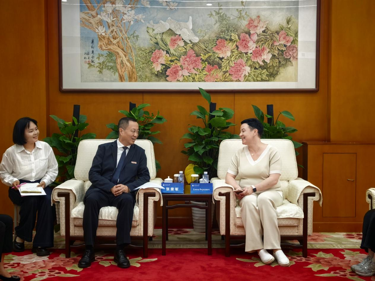 张荣军首先对叶莲娜·亚努科维奇一行来校访问表示热烈的欢迎,简要介绍了学校办学历史与国际化办学成果,回顾了学校与白俄罗斯交流基本情况。他表示近年来学校坚持开放办学,不断深化同国际高校间的合作与交流,期待双方在本硕联合培养、师生互派、科研合作等方面取得丰硕的合作成果。