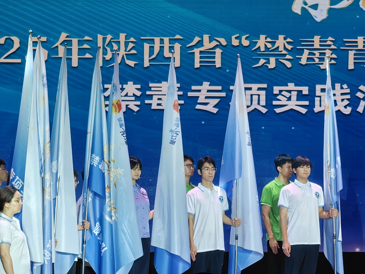 本次活动通过科技、艺术与传统文化相结合的创新形式,全方位展现陕西省禁毒工作成果,号召全社会特别是青少年群体积极参与禁毒行动,共同守护“无毒三秦”。作为禁毒宣传的骨干力量,来自全省21所高校的禁毒实践团代表在现场接受了“禁毒青力量”2025年大学生暑期“三下乡”社会实践授旗,以青春誓言扛起禁毒重任。beat365电子工程学院学生高杨岩锟作为代表之一,上台接过象征使命与责任的“禁毒青力量”旗帜。