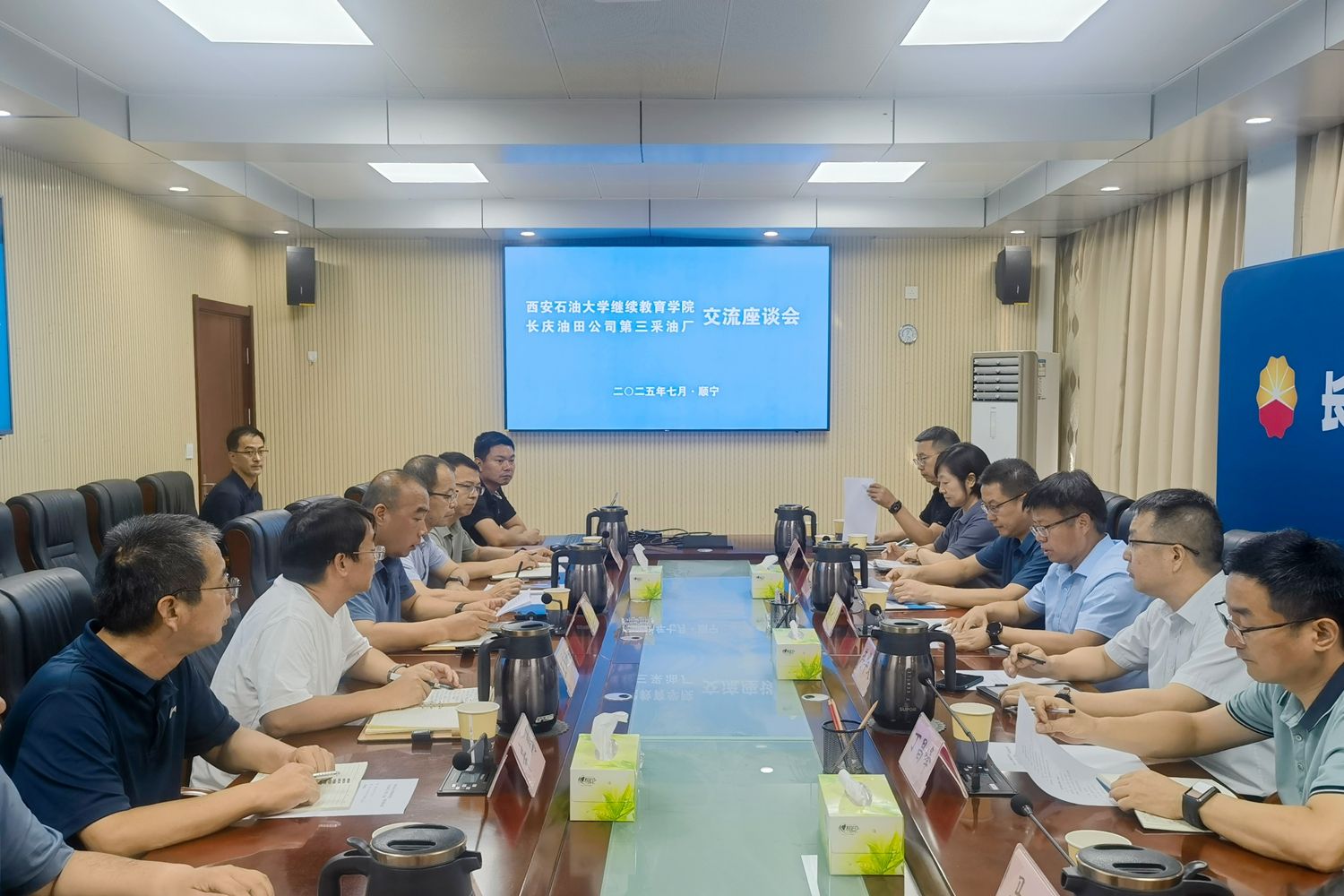 7月28日下午,张骁勇一行与延长油田总工程师王永东及相关部门负责人座谈。王永东介绍了延长油田的战略使命及面临的老油田挖潜增效、数字化转型、绿色低碳等技术挑战,希望获得高校支持。张骁勇介绍了学校在学科优势、科研方向、人才培养等方面的对接能力。双方围绕“老油田稳产技术攻关”“数字化油田管理人才培养”“新能源与传统油气协同开发研究”等议题深入探讨,初步明确将在科技项目联合申报、油田技术人员继续教育及培训、定向输送高素质专业人才等方面开展务实合作。