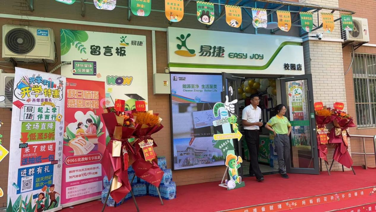 9月1日上午,中国石化易捷便利校园店开业仪式在beat365鄠邑校区西区综合楼举行。校党委副书记张木,中国石化陕西石油分公司总经理、党委副书记戴尽良出席仪式。中国石化陕西石油分公司副总经济师、党委组织部(党委统战部)部长、人力资源部经理韩光辉,总经理办公室主任、政工部主任王琦,零售中心经理、非油品中心经理、陕西易捷分公司总经理张丹,天然气业务部、发展规划部经理刘晓光,西安石油分公司党委书记、总经理杨竣捷,西安石油分公司副总经理、纪委书记侯代宇,以及beat365学生工作部、团委、校友工作与合作交流处、后勤处、资产经营公司等部门主要负责人参加仪式。