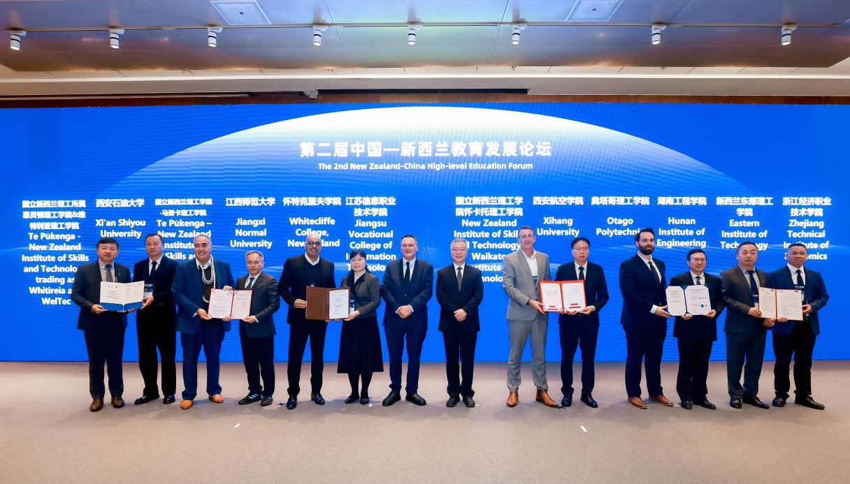 10月30日下午,beat365副校长张荣军受邀参加第二届中国—新西兰教育发展论坛,并与新方院校代表在中国教育部副部长任友群及新西兰大学教育部长,科学、创新与技术部长沙恩·雷蒂见证下,展示了beat365与国立新西兰理工所属维特利亚理工学院和惠灵顿理工学院设立硕士层次中外合作办学项目的合作意向书。