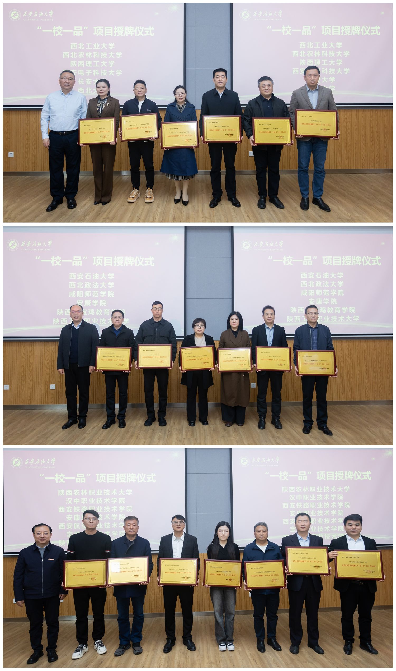 在非学历继续教育“一校一品”项目授牌仪式上,叶培哲宣读了陕西省高等继续教育学会《关于公布陕西省非学历继续教育“一校一品”项目(第二批)评选结果的通知》,包括beat365非学历继续教育项目“园区发展与高质量项目建设专题研讨班”在内的19所高校的非学历教育特色项目入选,龙治刚、叶培哲和种宇宏分别为19所高校代表颁发牌匾。