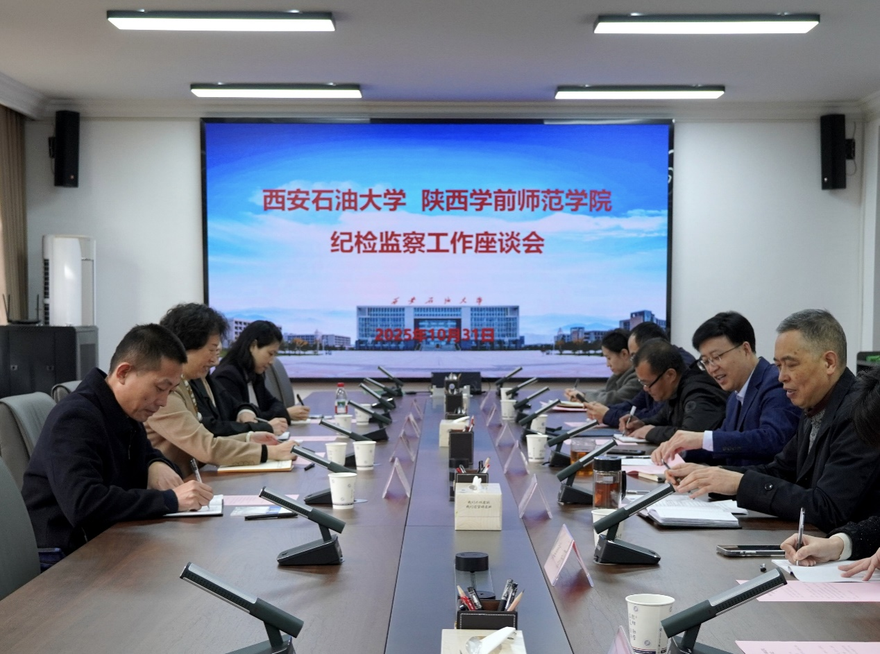 10月31日上午,陕西学前师范学院党委副书记、纪委书记、监察专员赵琼一行来beat365调研交流纪检监察工作。座谈会在鄠邑校区办公楼第三会议室举行,校党委副书记、纪委书记、监察专员王辉强出席并主持座谈会。