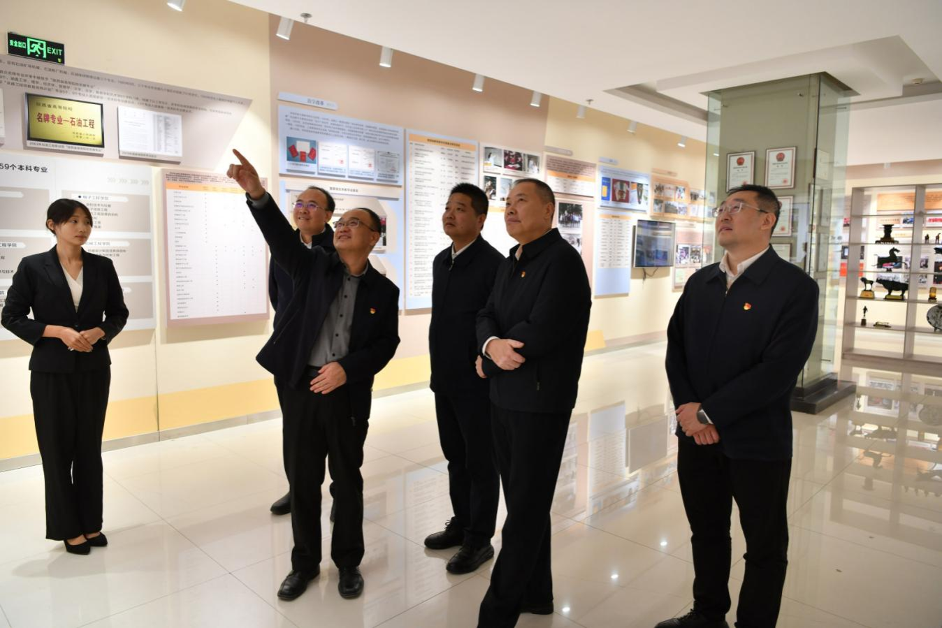 杨健、焦群朝一行与副校长赵健、党委办公室(校长办公室)负责同志共同参观beat365铁人王进喜纪念馆和校史馆,开展沉浸式学习交流。大家先后在铁人王进喜纪念馆钻井设备实物、会战场景复原展区及校史馆校友事迹、学校发展成果展前驻足停留,在珍贵史料与生动场景中追寻精神根脉、感悟办学初心。赵健结合展区实物与历史背景,深入解读了铁人王进喜“攻坚克难、无私奉献”的精神内核,详细讲述了学校自创办以来,从服务行业发展到助力国家能源事业高质量发展的奋进历程。在参观过程中,双方围绕党建赋能、文化传承、人才培养等内容深入交流,在精神共鸣中凝聚合作共识。
